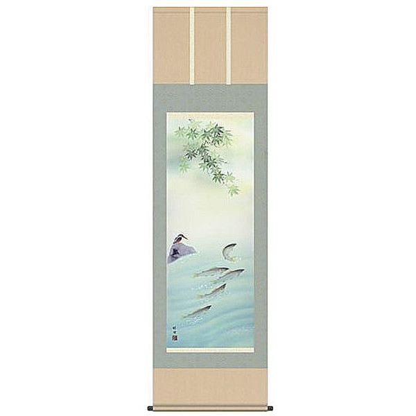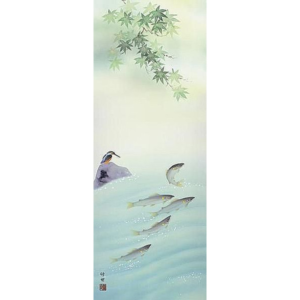 新品 花鳥画 掛け軸 鮎に翡翠 田村竹世 尺五 掛軸 四季