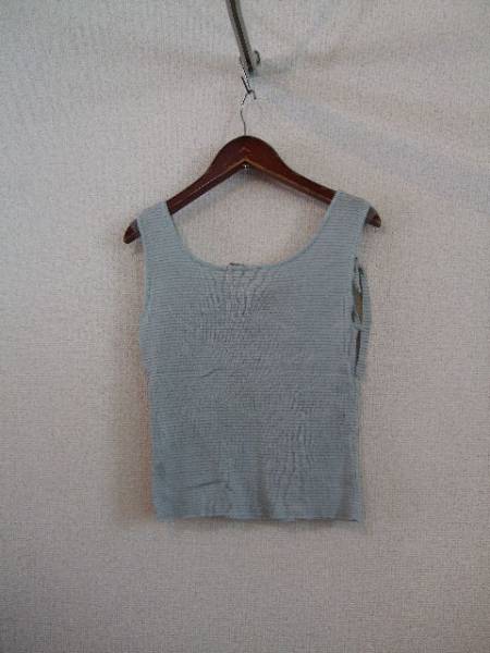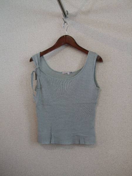 | 商品紹介 | 少し水色が混ざったような淡いグリーンにグレーのボーダー柄の ノースリーブです。 右肩のリボンがデザインのポイントになっています。 (外すことも可能です。) 素材はコットンニットです。 《素材》 綿100% |