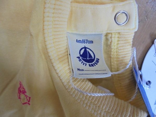 フランスのプチバトーのアウトレット店で購入いたしました。店員の方のお話では、過剰に作りすぎた商品、シーズンオフの商品で、特にダメージがあるわけではないとのことです。