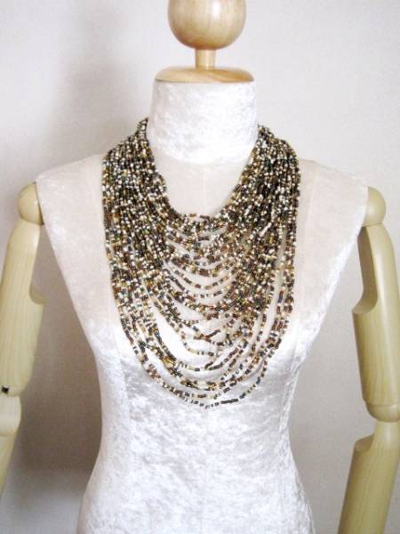 素敵な光沢ビースでデザインされたゴールド、ブロンズとカラフルビーズの大胆で大ぶりなネックレスです♪