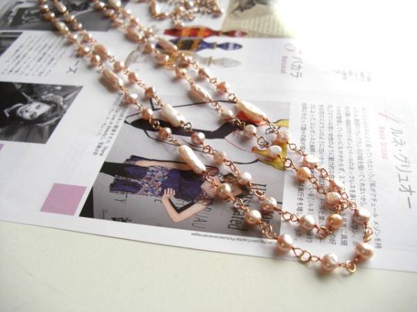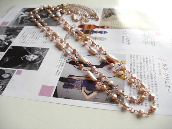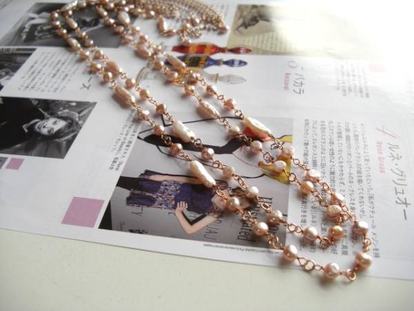 巴里色スケッチ・・シリーズです♪薔薇色のパール・・やさしいパープルピンクの淡水パールのネックレス2点セットです♪同じデザインの長さ違いです♪ポテトやステックなどデザイン違いのパールは淡いピンク色がさりげなく華やかです♪重ねてネックレスに1本をブレスレットにと色々に楽しんでいただけます♪5ミリから15ミリ位までのポテトやステックのパールをピンクゴールドのチェーンで紡ぎました♪長い方のネックレスは全長110センチ位で調節自由です♪短い方のネックレスは全長90センチ位で調節自由です♪単品やピアスも出品しています♪シンプルで飽きのこないいつまでも着けられるデザインを考えて作りました!ハンドメイドをご理解頂いてノークレーム、ノーリターンでお願いします