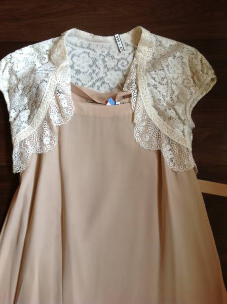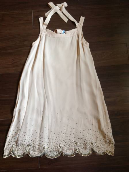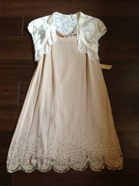 ワンピースは クリーム色で 裾付近にビーズが散りばれられて可愛いです。
