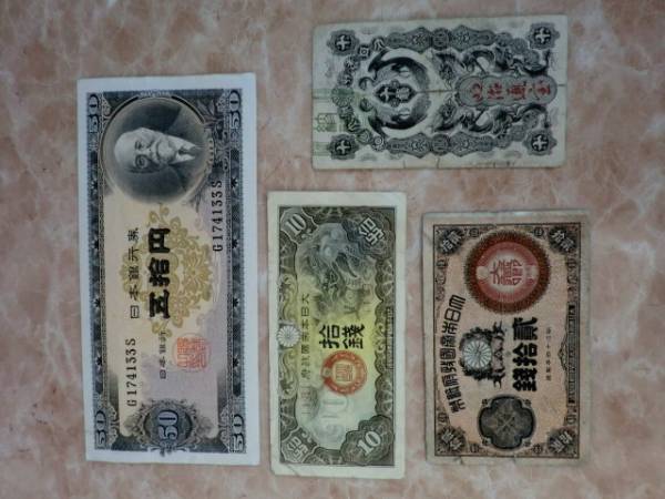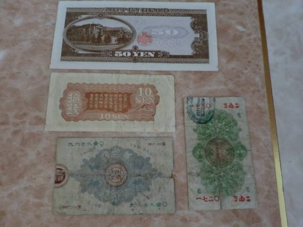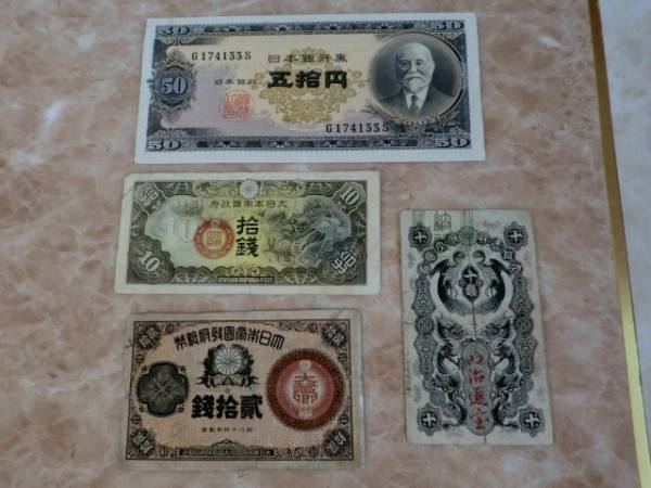改造紙幣20銭 大蔵卿20銭・明治通宝10銭・日華事変軍票 戊号10銭・日本銀行券B号50円 高橋50円の4枚セットです。