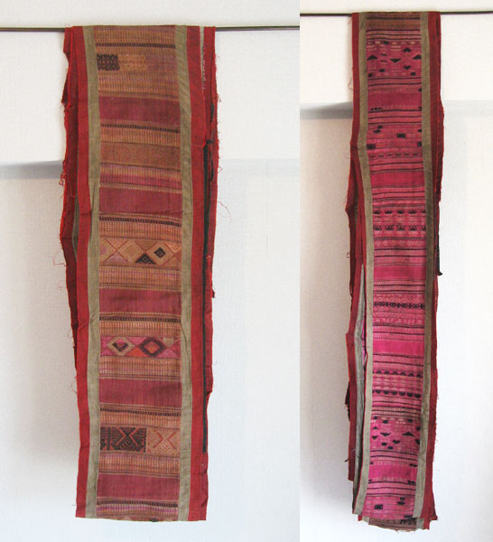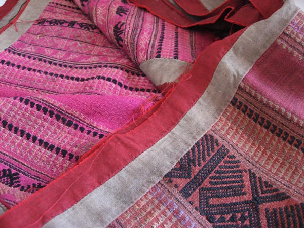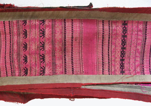 ピンク系のシルク地に幾何学模様、精霊動物などの刺繍が施されたラオスの寺院の蚊帳飾り布。