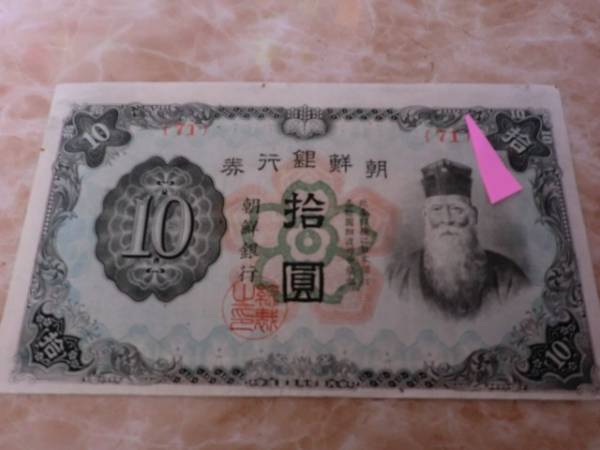 朝鮮銀行券 朝甲10円券で裁断のズレ有りです。