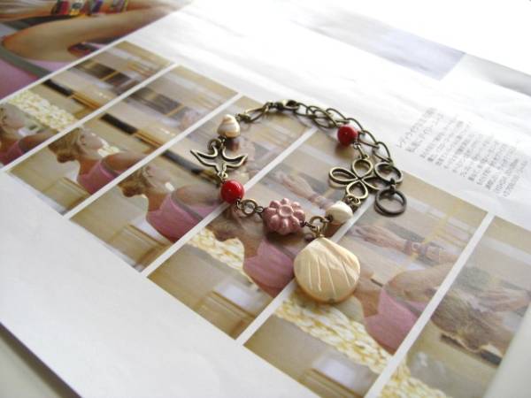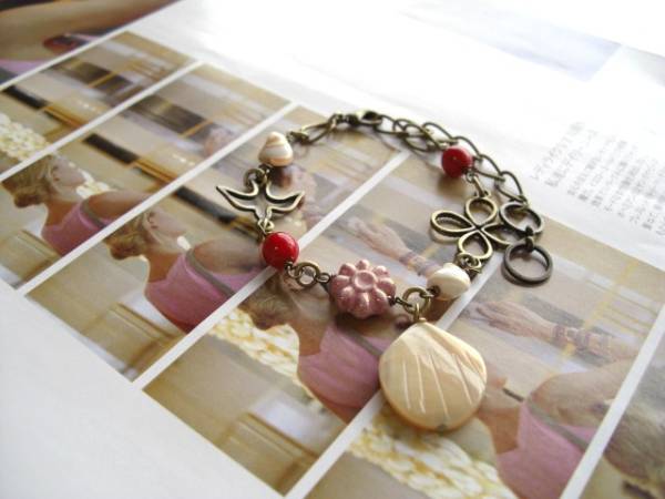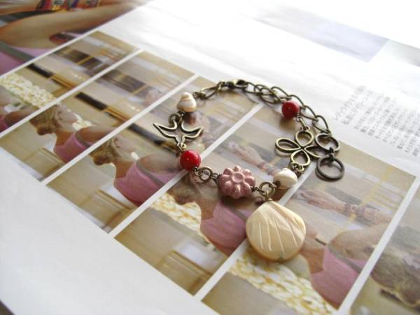 やさしさを紡いで・・シリーズです♪パリ色の午後・・キュートなマザーオブパールと珊瑚のブレスレットです!シックなベージュ色のマザーオブオパールに深い赤の珊瑚やお花や小鳥さんの透かしチャームを合わせてロマンチックな表情です♪珊瑚は6ミリの丸玉、マザーオブパールは8ミリ位、チェコのお花は11ミリ位です♪トップのマザーオブパールは20×18ミリ位です♪長さは全長23センチ位で調節自由です♪お揃いのネックレスも出品しています♪ハンドメイドをご理解いただいてノーリターン、ノークレームでお願いします。