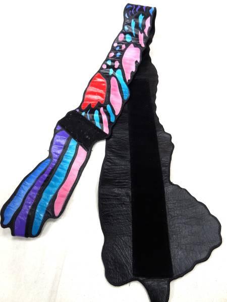 とても手の込んだつくりのハンドメイドです。素人レベルによるものではありません。レザー(もしくは合皮)にエアブラシでペイントしているようです。詳細を示すものはありません。インテリア,ディスプレイ,スタイリング,もちろん実用にも使えます。後ろ側がマジックテープで留める仕組みなのでベルトのみならず首にかけることも可能です。完全に1点物なので二度と出会うことはないと思います。価値をご理解頂ける方の入札をおまちしております