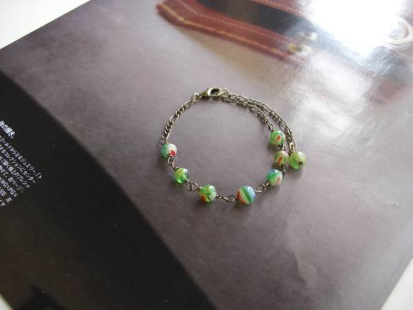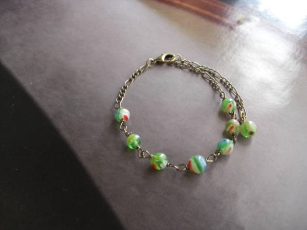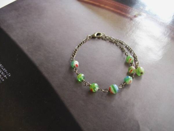 初夏の物語・・シリーズです♪深い緑色・・小花柄のベネチアビーズのブレスレットです♪華奢なチェーンを合わせて大人のロマンチックしています♪6ミリの丸玉の小花柄のベネチアビーズはランダムに繋いで可憐な表情です♪長さは全長23センチ位で調節自由です♪お揃いのブレスレットやネックレスも出品しています♪シンプルで長く着けて頂けるデザインを考えて作りました♪♪ハンドメイドをご理解頂いてノークレーム、ノーリターンでお願いします