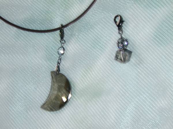 新品・ハンドメイドです。 カラー 三日月 キューブ 透明の黒(スワロフスキークリスタルを使用しています。) 革紐 ブラウン 金具の色 黒 サイズ 月 30mm 香水瓶モチーフ 2cm 革紐の長さ 54cm アジャスター5.5cm 香水瓶モチーフと、三日月の2つのペンダントヘッドのついた革紐ペンダントです。 どちらも外して他のヘッドをつけることも可能です。 香水瓶はモチーフですので、実際香水は入れられません。 |