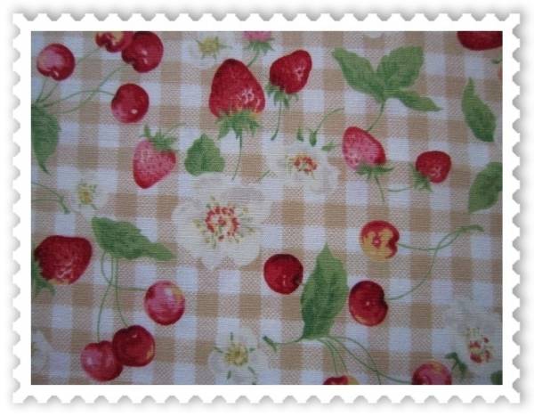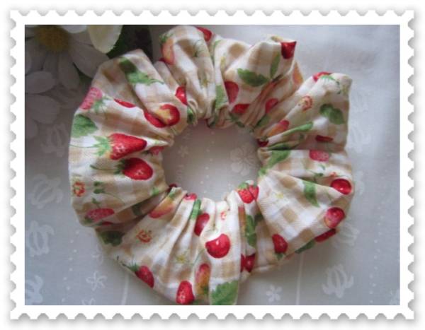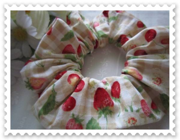 ★シュシュ★イチゴとチェリーのチェック柄☆ベージュ系☆