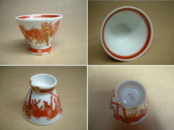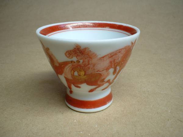 明治期頃の赤九谷・ハ馬・盃です。高台にカケ直しが2ヶ所あります。高台内に九谷の銘があります。口径5×底2.5×高3.5センチです。
