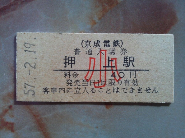 昭和57年 京成電鉄押上駅硬券入場券小児用40円(地紋なし)