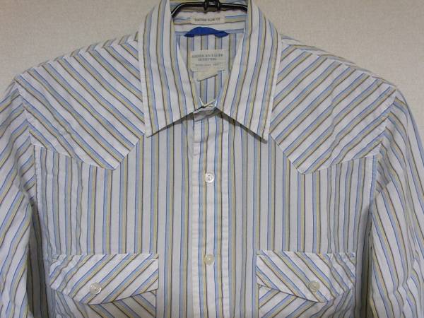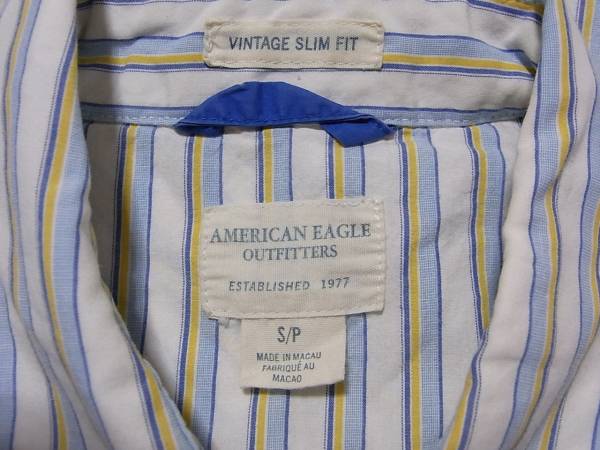 即決!USA古着●AEアメリカンイーグルストライプデザインシャツS!アメカジレア!アメリカで買ってきましたカジュアルブランドとして有名なアメリカンイーグルのストライプ長袖シャツです。カラーは写真を参考にして下さい。表記サイズSで着丈(後ろ)約73.5cm、身幅約49cmです。素人採寸ですので多少の誤差はご了承お願い致します。状態は古着ですので、ある程度の着用感あります。特別目立つキズ、よごれはありませんが、あくまで古着として考えてください。古着にご理解のある方の入札お願いします。定形外郵便または、ゆうパック着払いでの発送になります。他にもいろいろ出品しています。よろしくお願いします。