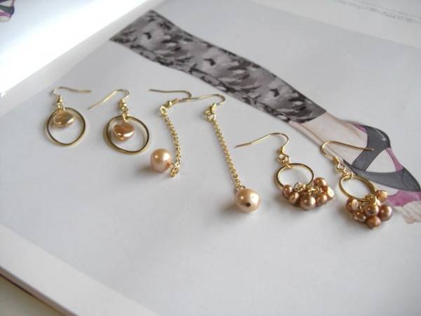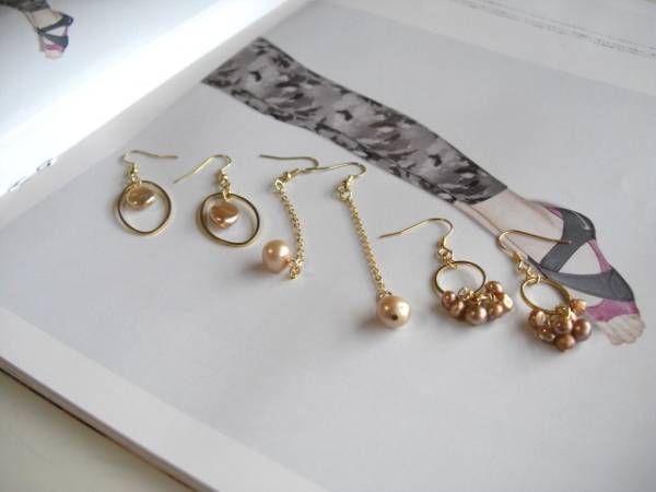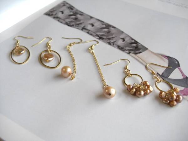 モダン・ガール・・シリーズです♪特別のパール・・シックなシャンパンゴールドの淡水パールのピアス3点セットです♪デザイン違いのペア3組です♪4ミリから11ミリ位までのポテトやバロックやオーバルなどデザイン違いの淡水パールに華奢なチェーンやデザインリングを合わせて可憐な表情です♪長さは左のオーバルのパールにデザインリングを合わせて4.7センチ、真ん中は8ミリのパールにチェーンを合わせて8センチです♪右は小さなパールを集めて4・5センチ位です♪それぞれイヤリングにも変更出来ます♪お揃いのネックレスやブレスレットも出品しています♪シンプルで長く着けていただけるデザインを考えて作りました♪♪ハンドメイドをご理解頂いてノークレーム、ノーリターンでお願いします。