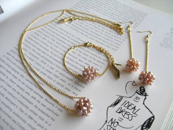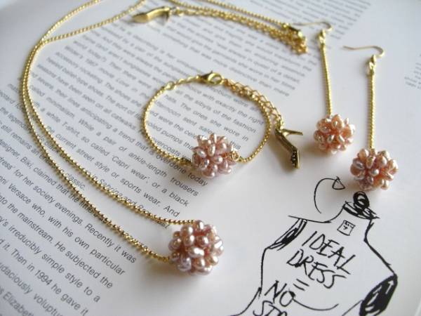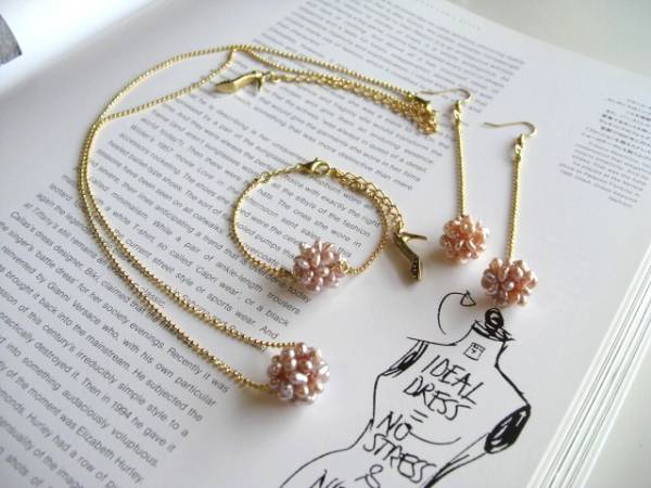 巴里色デッサン・・シリーズです♪休日のパール・・シックなモーヴ・ピンクの淡水パールのネックレスとブレスレット、ピアスの3点セットです♪甘すぎないピンクの淡水パールの編み玉が可憐な表情です♪ネックレスは華奢なカットボールチェーンに16ミリ位の編み玉パールを合わせました♪長さは60センチ+アジャスター12センチで最長72センチ位です♪ブレスレットは13ミリ位の編みパールを合わせました♪長さは16センチ+アジャスター6センチで最長22センチ位です♪ピアスは13ミリの編みパールです♪長さは9センチ位です♪イヤリングにも変更出来ます♪それぞれ単品も出品しています♪シンプルで飽きのこないいつまでも着けられるデザインを考えて作りました!ハンドメイドをご理解頂いてノークレーム、ノーリターンでお願いします