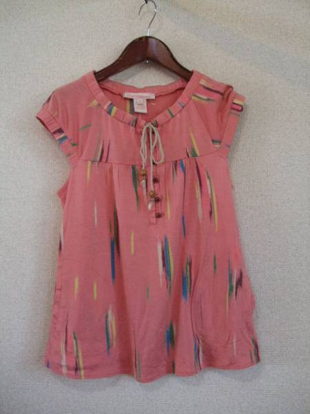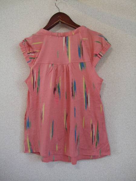 商品紹介 | ピンク地にカラフルな線状のプリントがオシャレな カットソーです。 袖はフレンチスリーブで、襟元にボタンと紐が付いたデザインに 身頃はふんわりAラインです。 素材:シルク55% コットン45% |