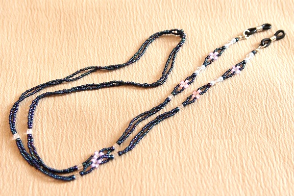 手作りのメガネチェーンはDeep blueBeadsを編み込んで上品に仕上げました。