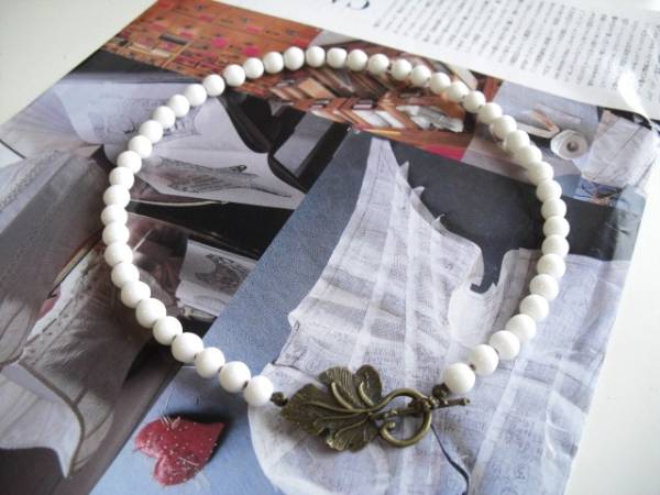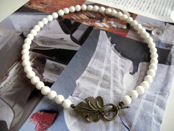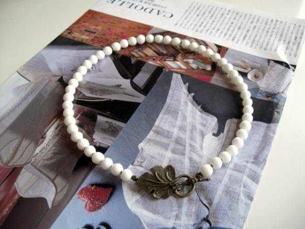 巴里色・デッサン・・シリーズです♪秋の美術館・・白のビンテージビーズのネックレスです♪クラシカルな葉っぱのトグルを合わせてロマンチックな表情です♪トルグを前にされたり後ろにされたり2パターンで楽しんでいただけます♪ビンテージビーズは8ミリ、葉っぱのトグルは37ミリ位です♪ネックレスの長さは46センチ位です♪お揃いのブレスレットも出品しています♪シンプルで飽きのこないいつまでも着けられるデザインを考えて作りました!ハンドメイドをご理解頂いてノークレーム、ノーリターンでお願いします