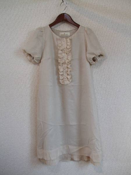 | 商品紹介 | パフスリーブや胸元のフリル等の上品な形がステキなワンピースです。 裾に向かってやや広がるすっきりした形でスソはプリーツになっています。 色はラメが混ざったベージュです。 素材:表地・裏地 ポリエステル100% |