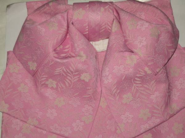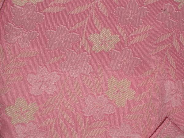 女性yukata用、地紋柄結び帯  すこしうすめピンク ポリエステル  新品(織り地紋柄ありです。波状の写りはレンズの光学的ないたずらで現品にはありません、また薄く濃く写っている場合もあります)、胴部--帯巾約17,0cmx長さ約130cm、リボン部は横に約30cm。見た範囲で汚れないと思いますが、着用に差し支えない薄汚れ(多分ない?)はあってものお値段で出品です。
