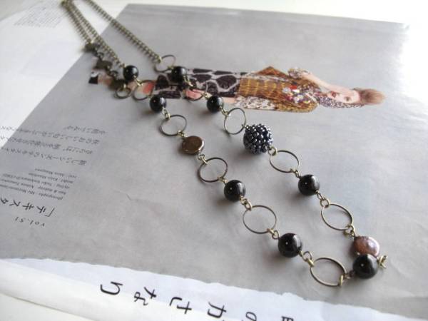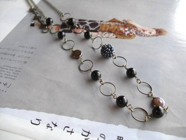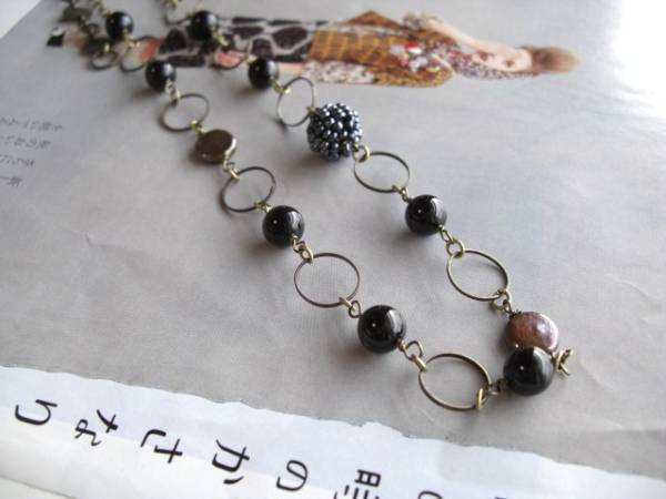 私的・クローゼット・・シリーズです♪シックなオニキス・・オニキスと淡水パールのキュートなネックレスです♪漆黒のオニキスとブロンズ色のパールが大人のロマンチックしています♪オニキスは8ミリと10ミリの丸玉です♪シックなブロンズ色の9ミリ位のコインの淡水パールとシックな12ミリ位のグレーのビーズボールを合わせました♪長さは全長66センチ位で調節自由です♪お揃いのブレスレットも出品しています♪シンプルで飽きのこないいつまでも着けられるデザインを考えて作りました!ハンドメイドをご理解頂いてノークレーム、ノーリターンでお願いします