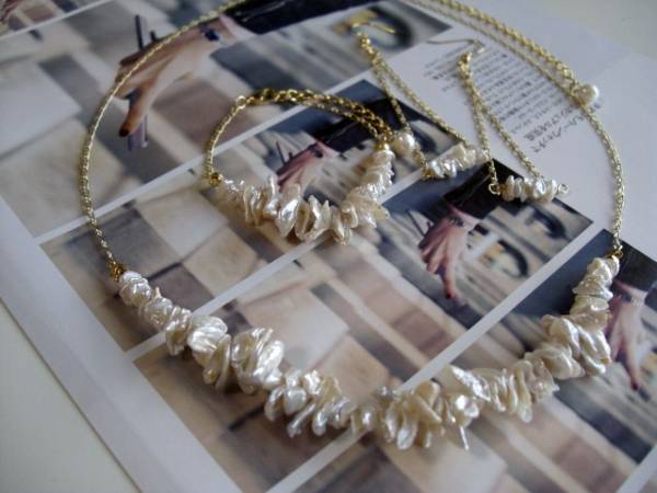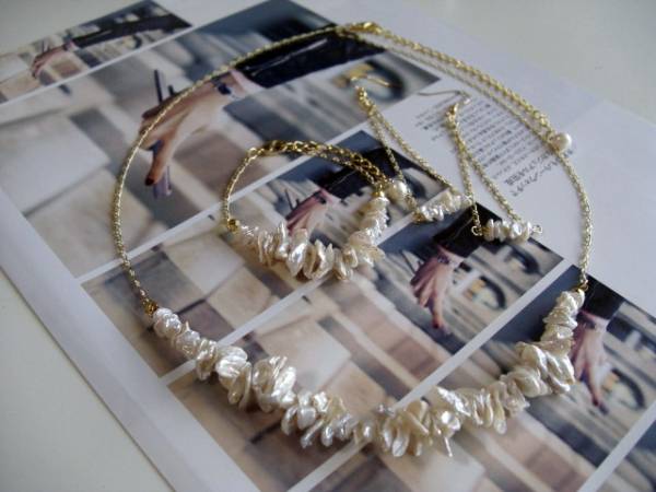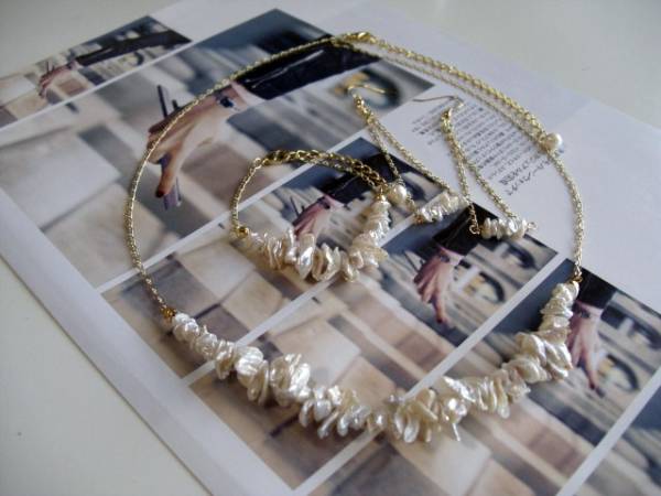 女の子らしさを+して・・シリーズです♪永遠のパール・・可憐な淡水パールのネックレス、ブレスレット、ピアスの3点セットです♪オフホワイトの芥子パールのチップは7ミリから18ミリ位です♪ふんわりやさしい白が大人のロマンチックしています♪ネックレスの長さは55センチ+アジャスター10センチで最長65センチ位です♪ブレスレットは16センチ+アジャスター6センチで最長22センチ位です♪ピアスは全長9センチ位です♪イヤリングにも変更出来ます♪それぞれ単品でも出品しています♪♪シンプルで飽きのこないいつまでも着けられるデザインを考えて作りました♪ハンドメイドをご理解頂いてノークレーム、ノーリターンでお願いします