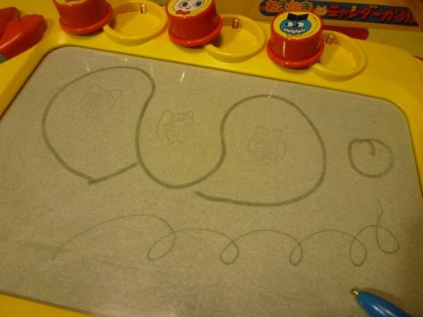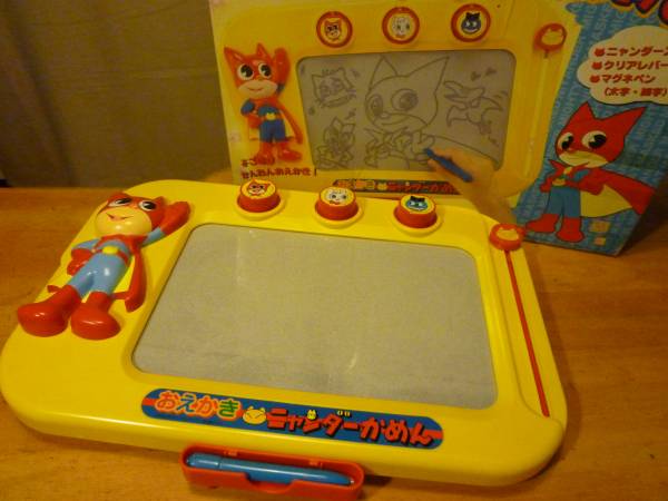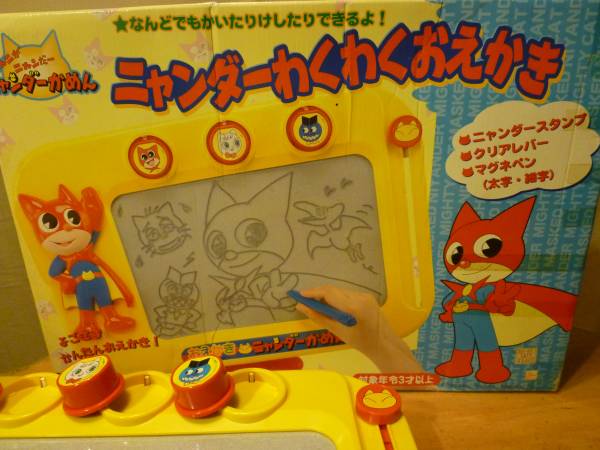 こちらは少し前のキャラクター やなせたかしさんの二ャンダーかめんの 二ャンダーわくわくおえかきになります。箱の見出しには、なんどでもかいたりけしたりできるよ!とあり、よごさず かんたんおえかき!等ともあり、キャラクタースタンプや太字と細字のマグネペン等セット内容は揃っていて、遊ぶまえに等の取り扱い方が箱にあります。
