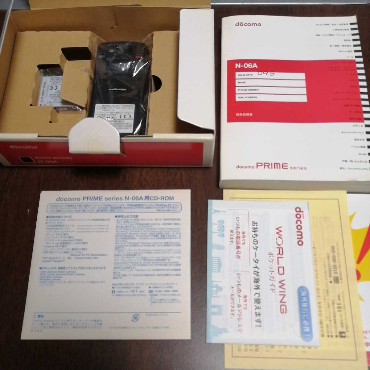 docomo N-06Aの新品未使用本体と付属品一式と他本体、充電池、付属CD、外箱、説明書です。