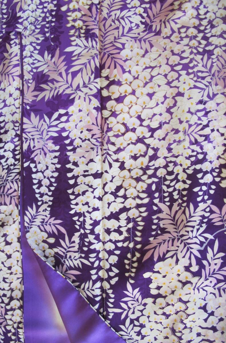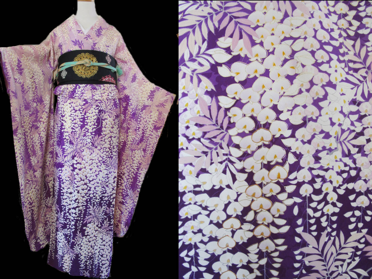 全身に藤の花が咲き誇る華やかな振袖です。 金彩、駒刺繍入りです。八掛は紫です。 紫の重ね衿がついています(衿裏地は元々ベージュ色です)。 お舞台に使われるのもいかがでしょうか。 |