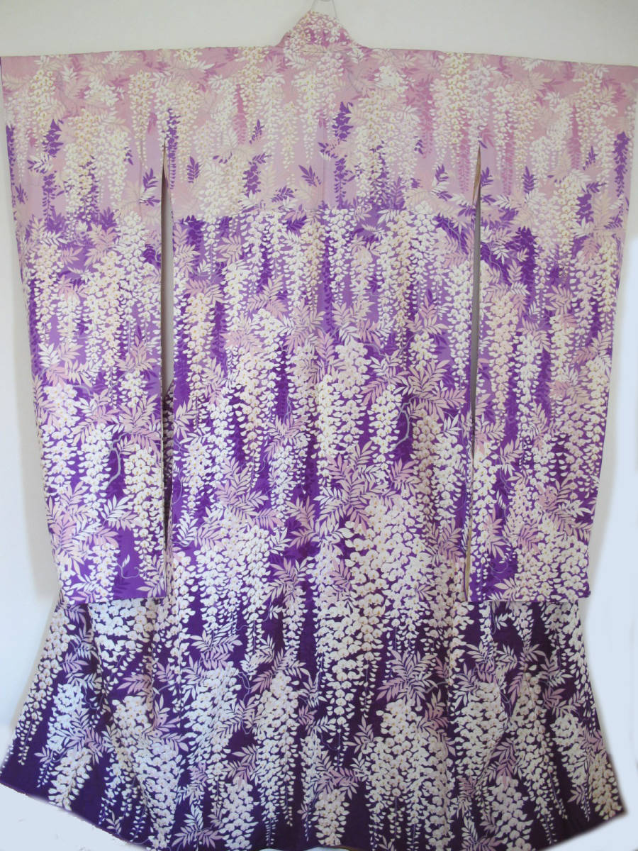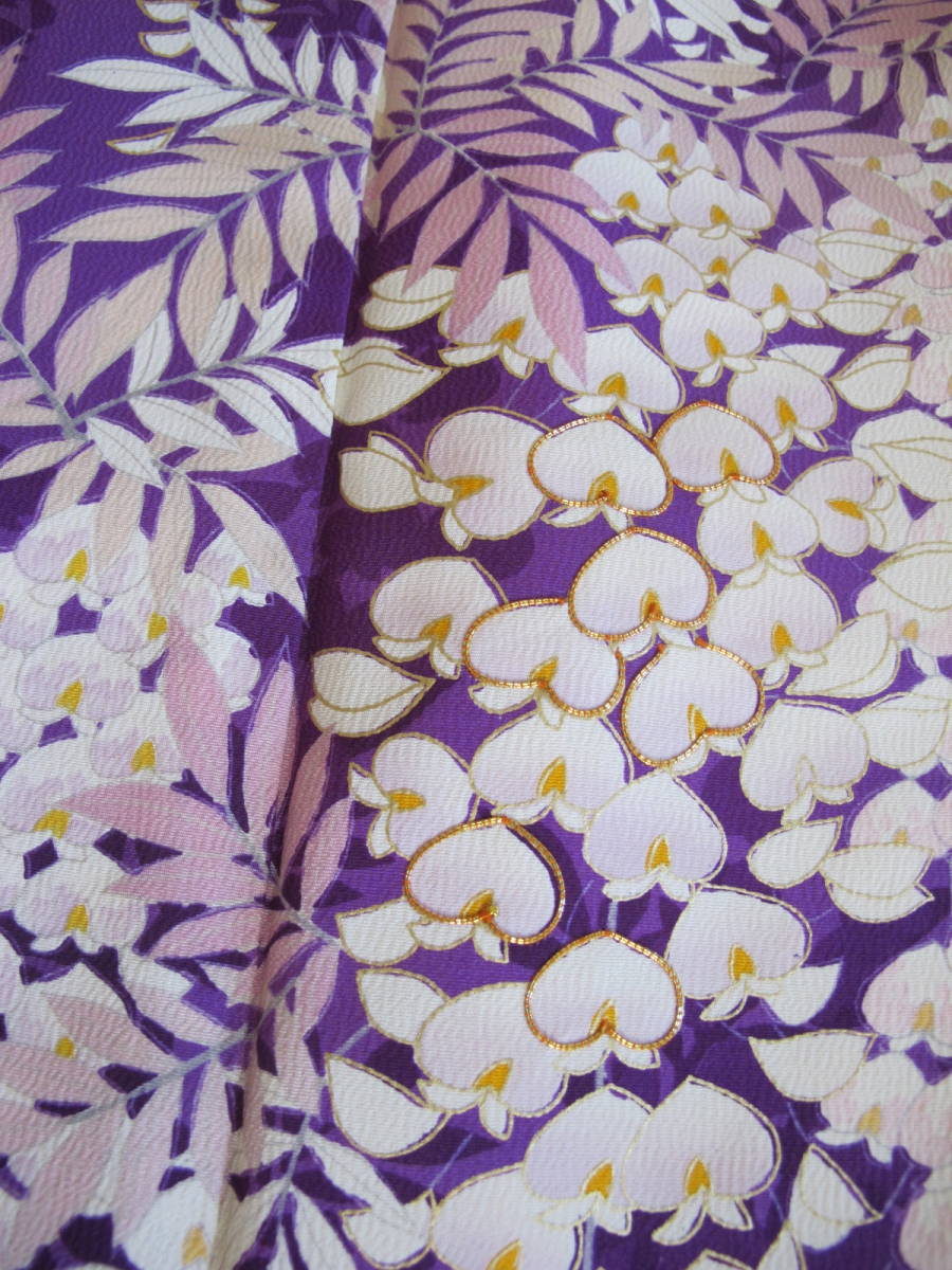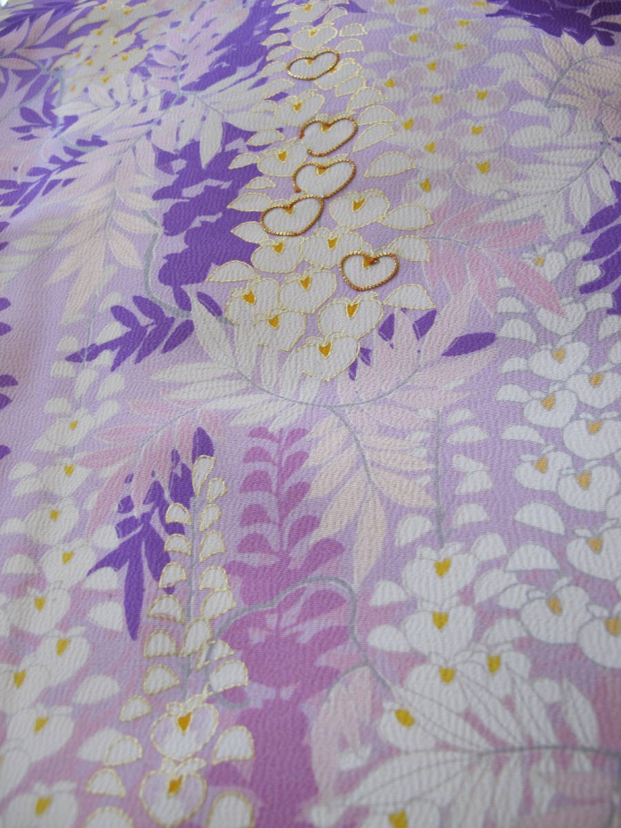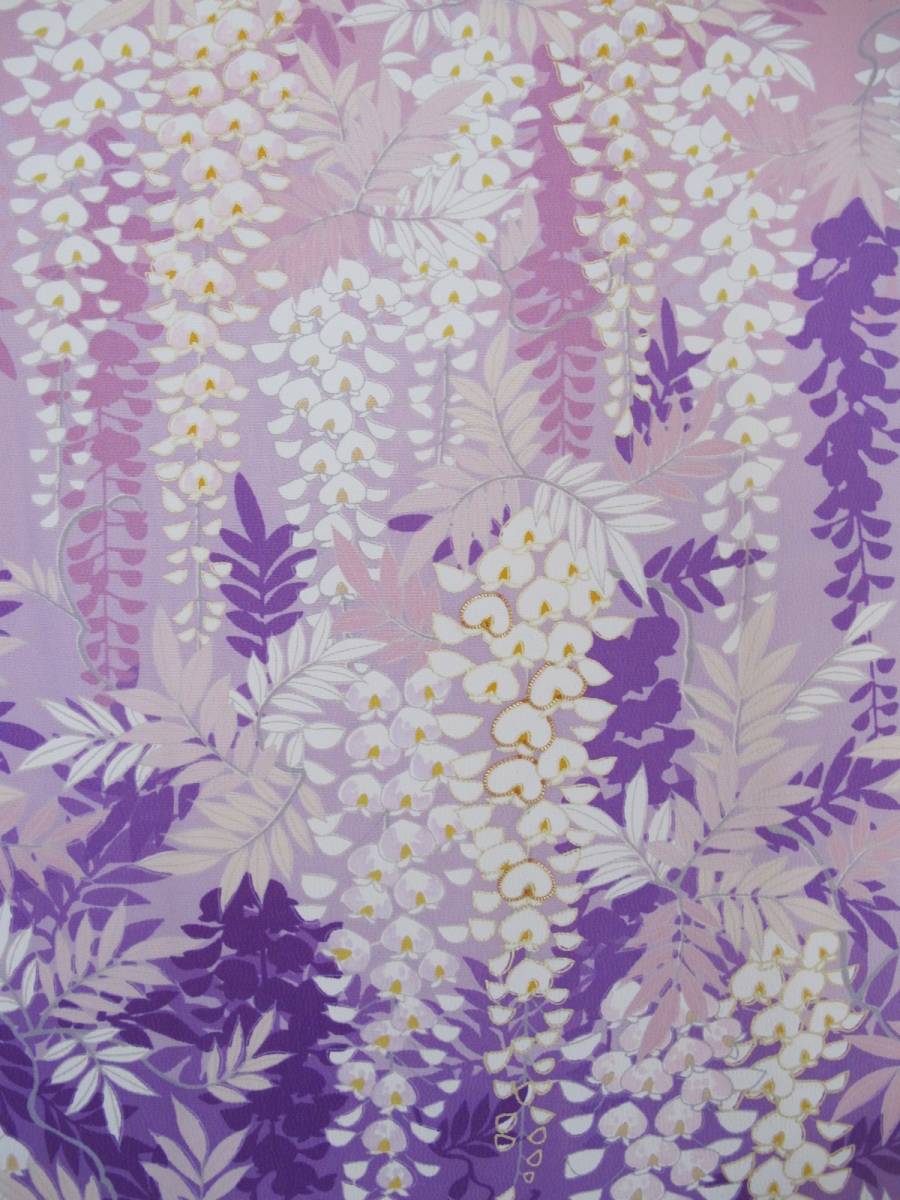 おおよその丈:身丈(肩)167cm、裄67cm、袖丈113cm、袖幅33cm、前幅23.5cm、後幅30cm 素材:正絹 お色:薄紫~紫
