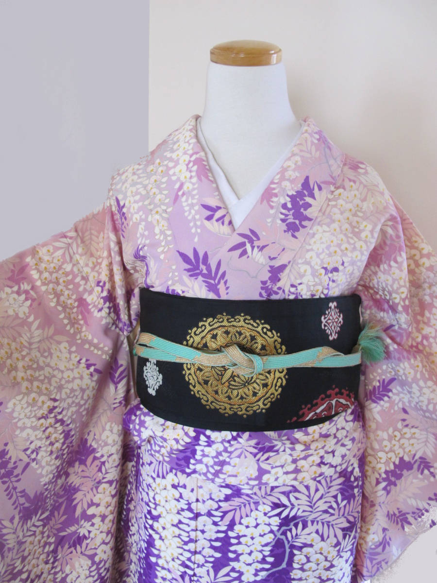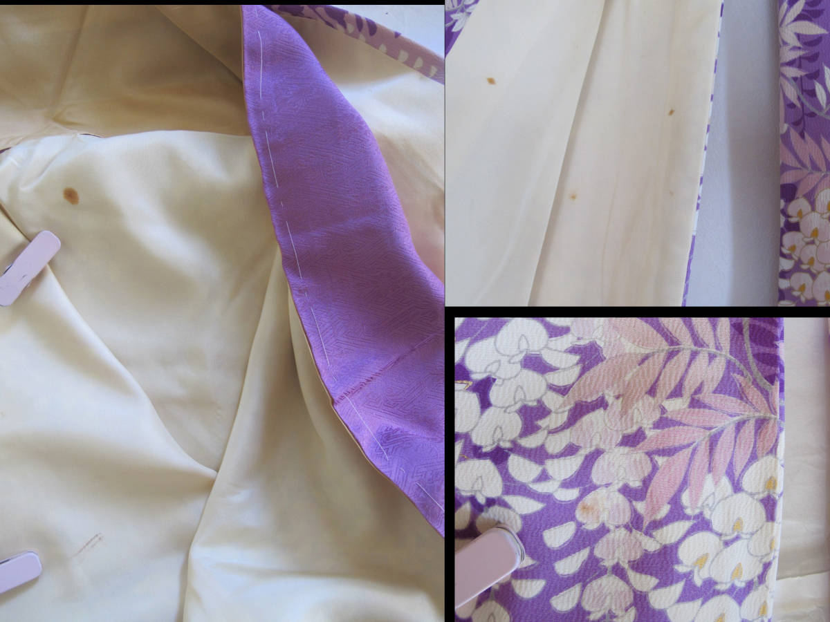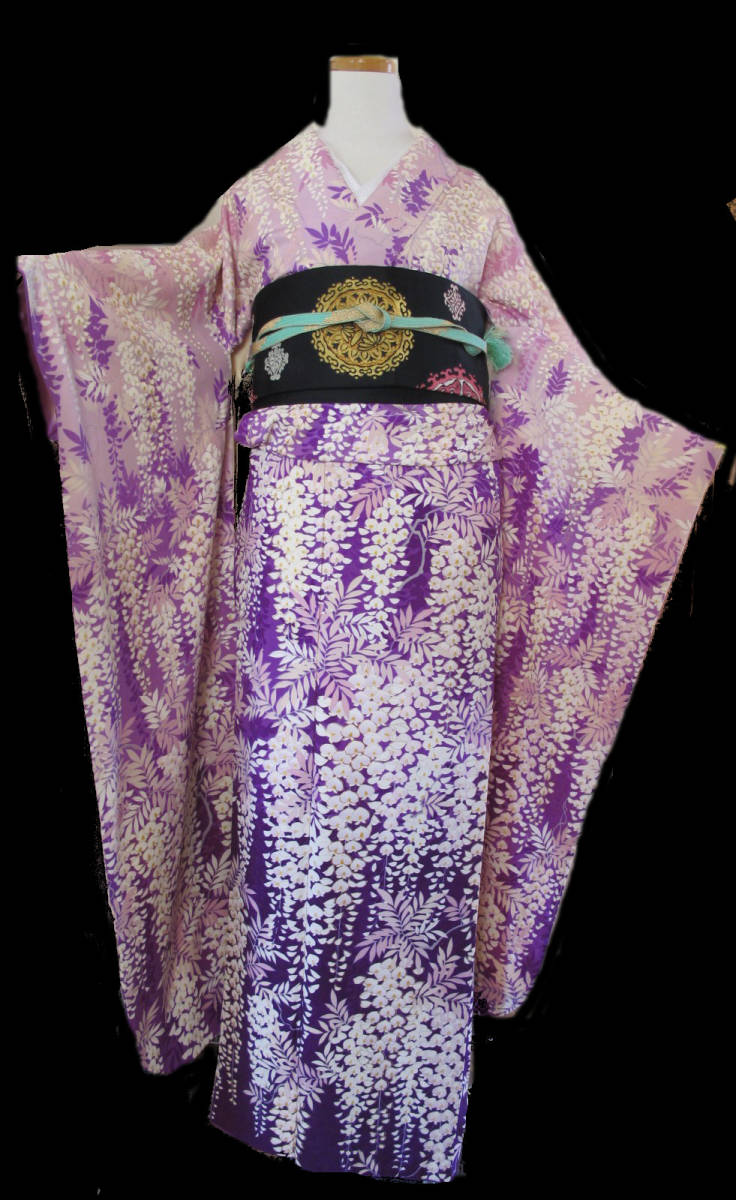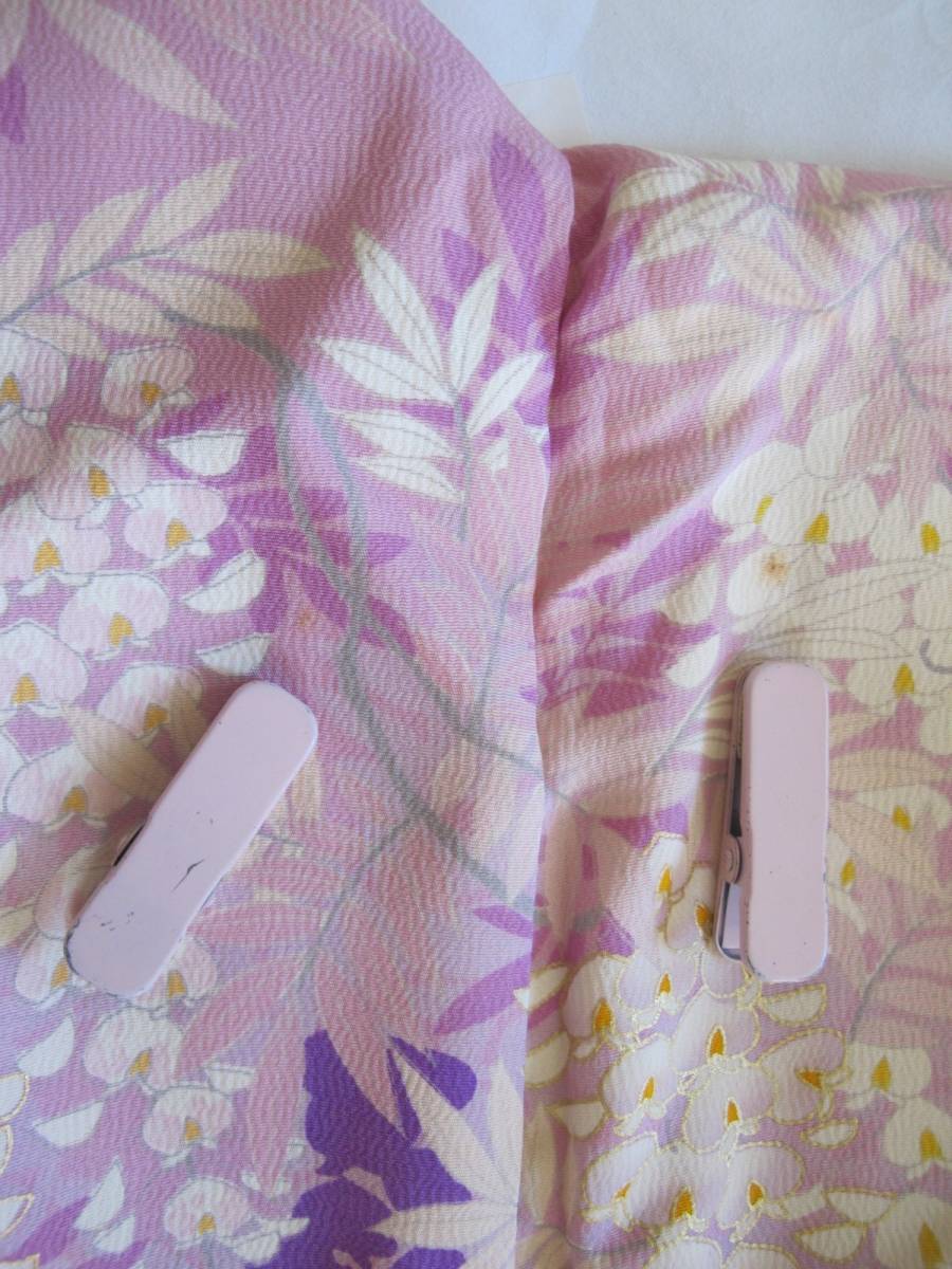 おおよその丈:身丈(肩)167cm、裄67cm、袖丈113cm、袖幅33cm、前幅23.5cm、後幅30cm 素材:正絹 お色:薄紫~紫