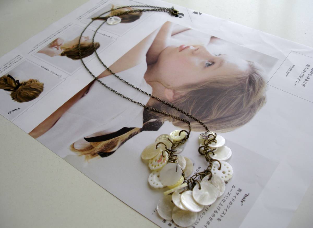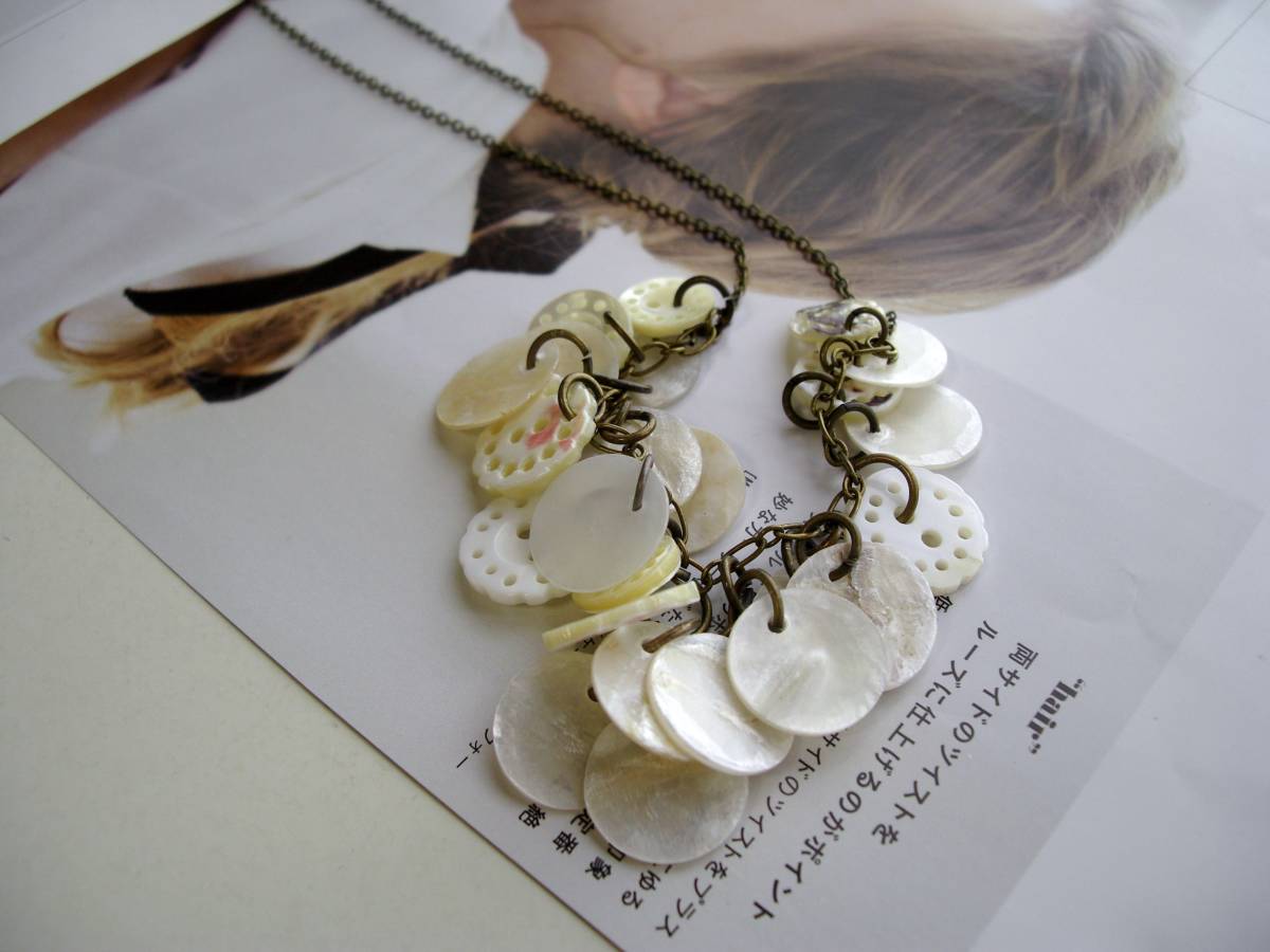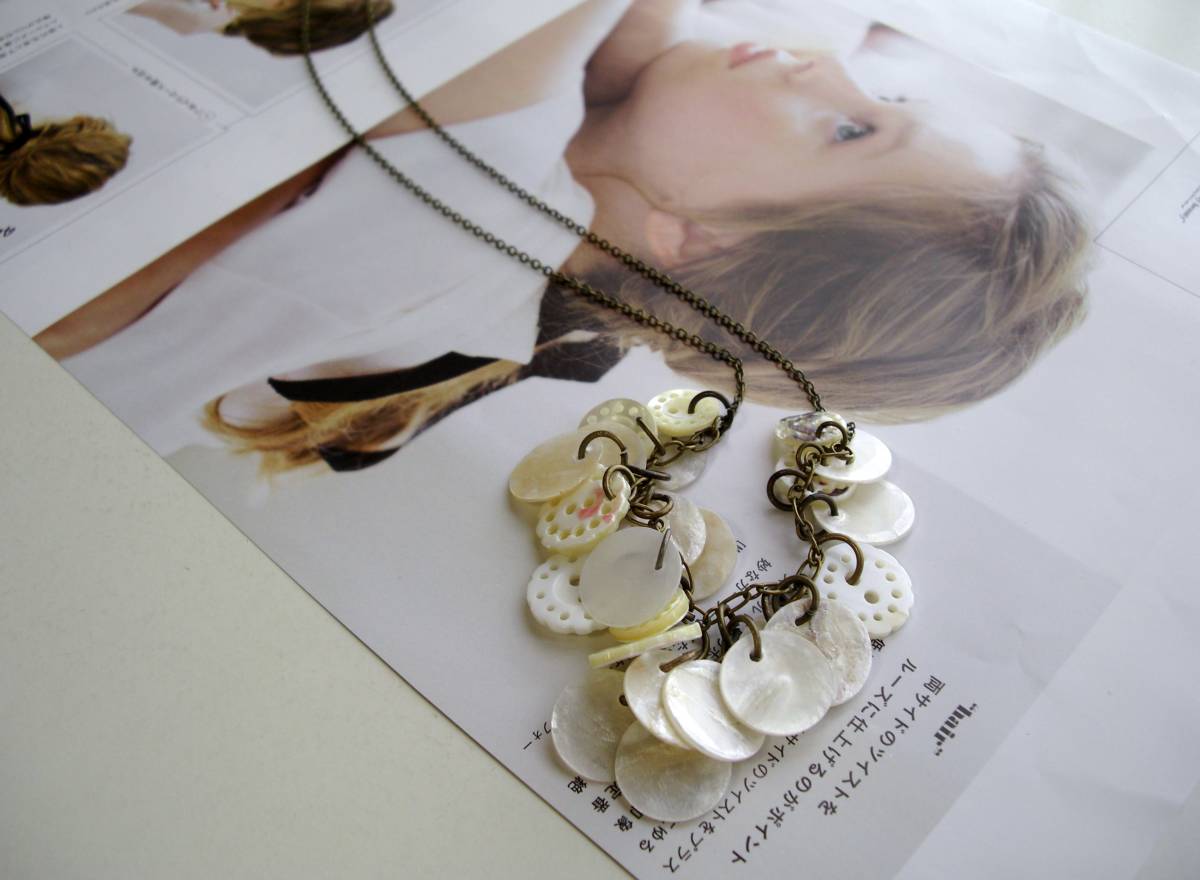 なりたい私に・・シリーズです♪物憂げなシェルを集めて・・12ミリから15ミリ位までのオフホワイトのラウンドシェルやレース模様のような透かしシェルボタンを集めてロマンチックなネックレスです♪長さは73センチ+アジャスター10センチで最長83センチ位です♪長さはご希望の長さに変更可能です♪お揃いのブレスレットやピアスも出品して います♪♪シンプルで飽きのこないいつまでも着けられるデザインを考えて作りました!ハンドメイドをご理解頂いてノークレーム、ノーリターンでお願いしま す