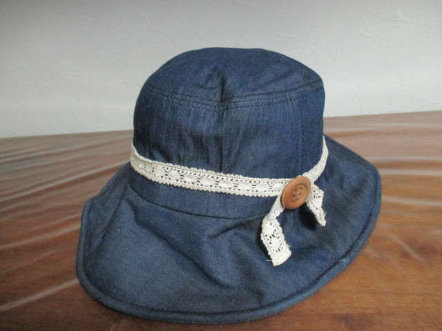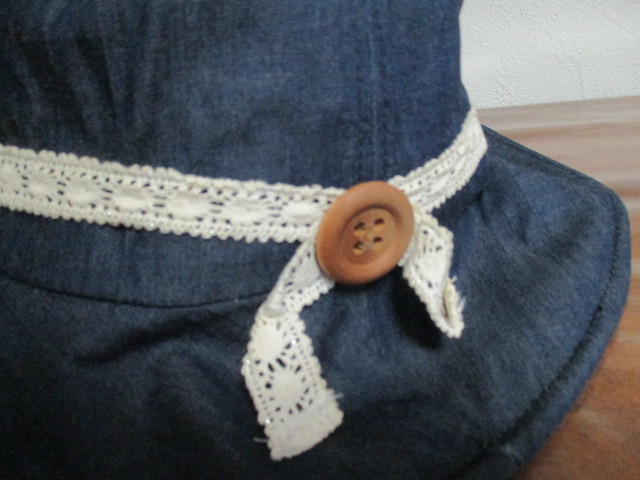 | 商品紹介 | 濃いめのデニムカラーに白のレースのリボン、ボタン飾りがかわいいです。 ツバの先端にワイヤーが入っていて、形を自由に変えられます。 綿100% *規定サイズに合うように、折りたたんでの発送となります。 |
