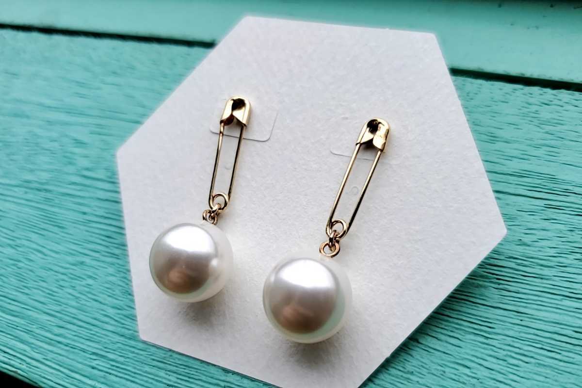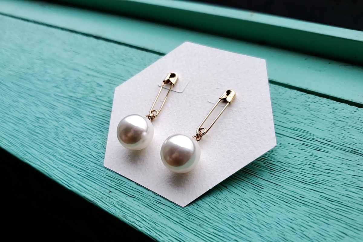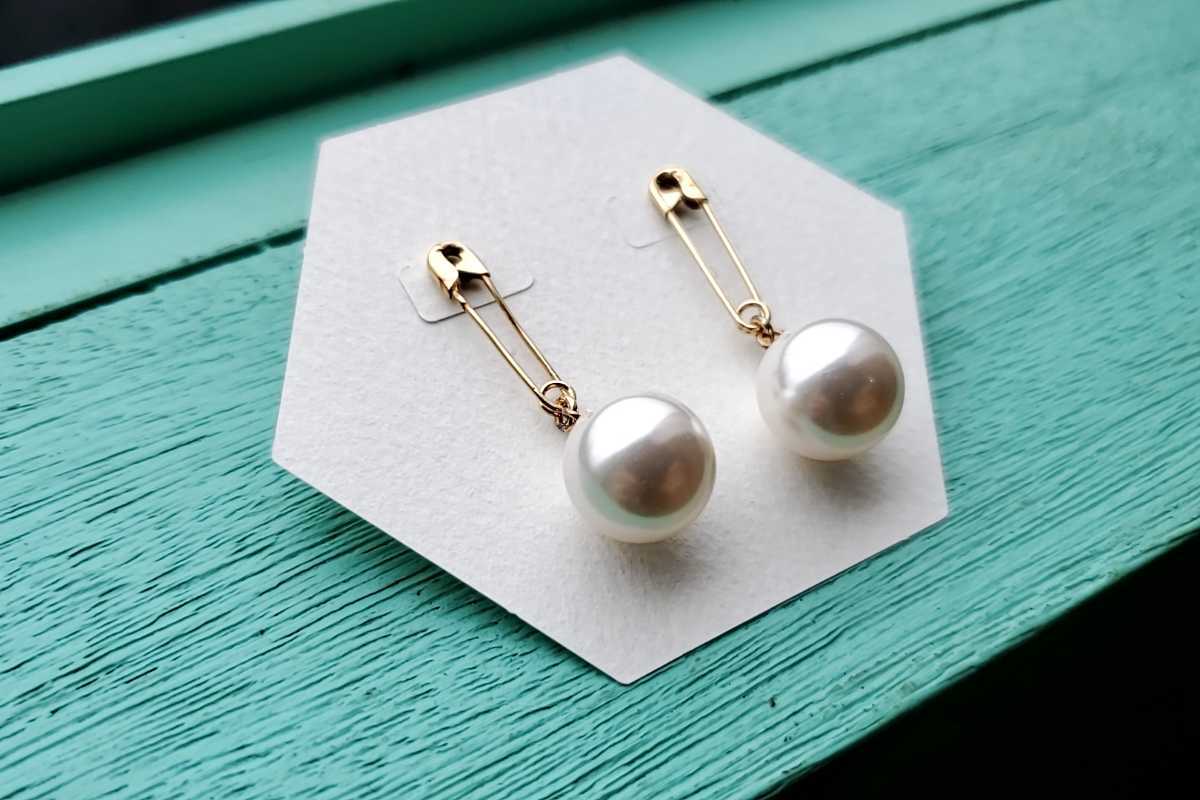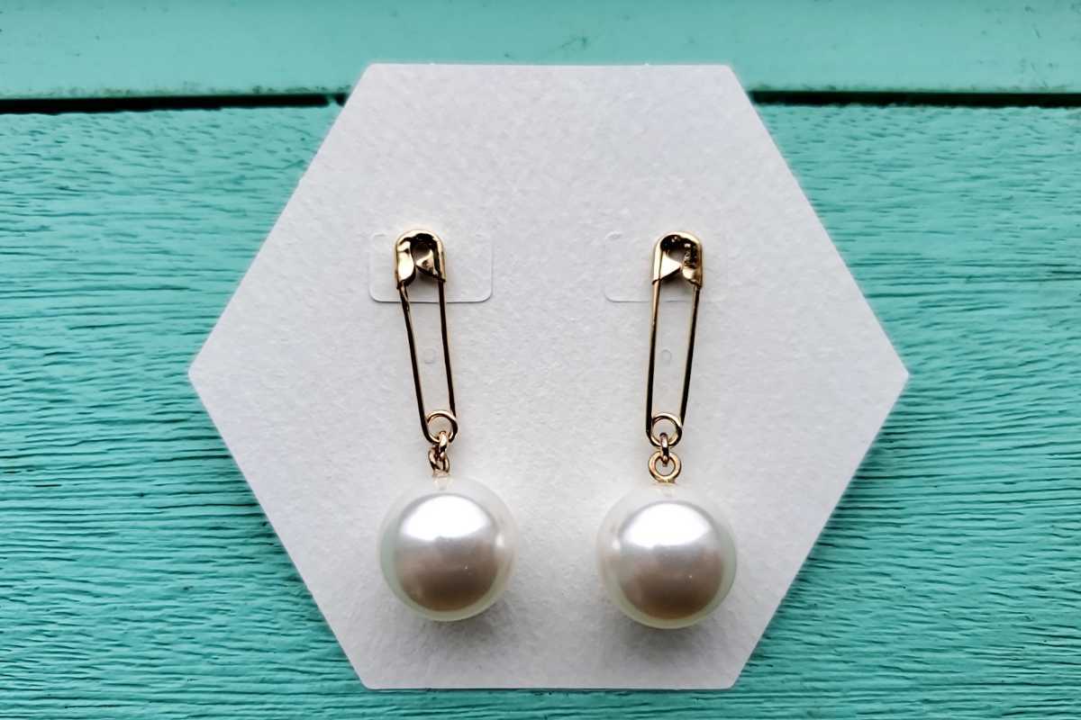 安全ピンからクリスタルパールが揺れるピアス。