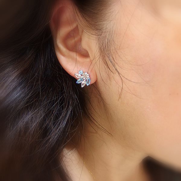 18金ホワイトゴールドの枠にラウンドカットとマーキスカットの青と透明の石をセットしたデザイン。