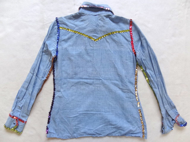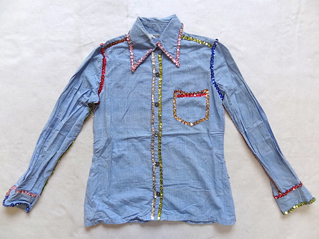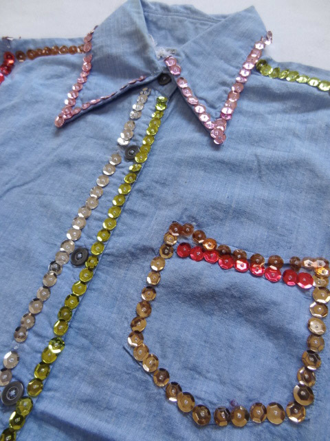 ビンテージ 希少 70S デザイナーズ カスタム リメイク マルチ カラー スパンコール 装飾 シャンブレー ドレス シャツ 再構築 レア デニム