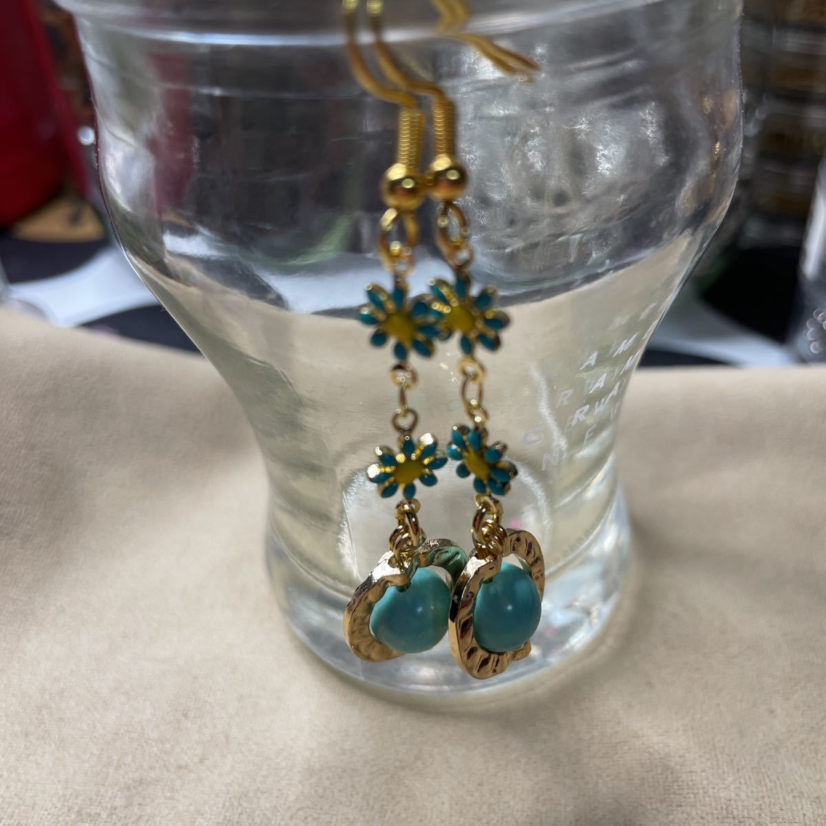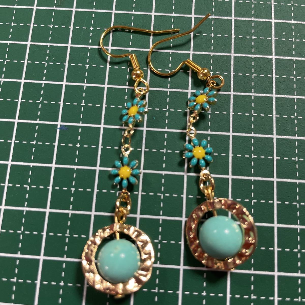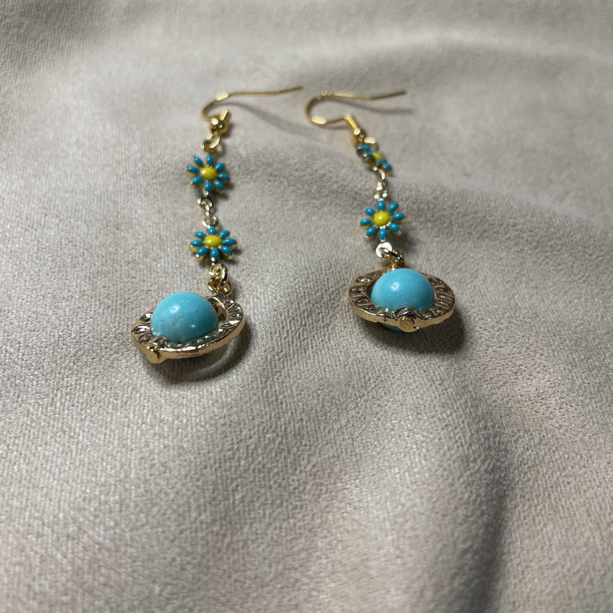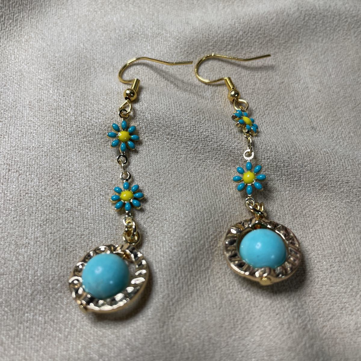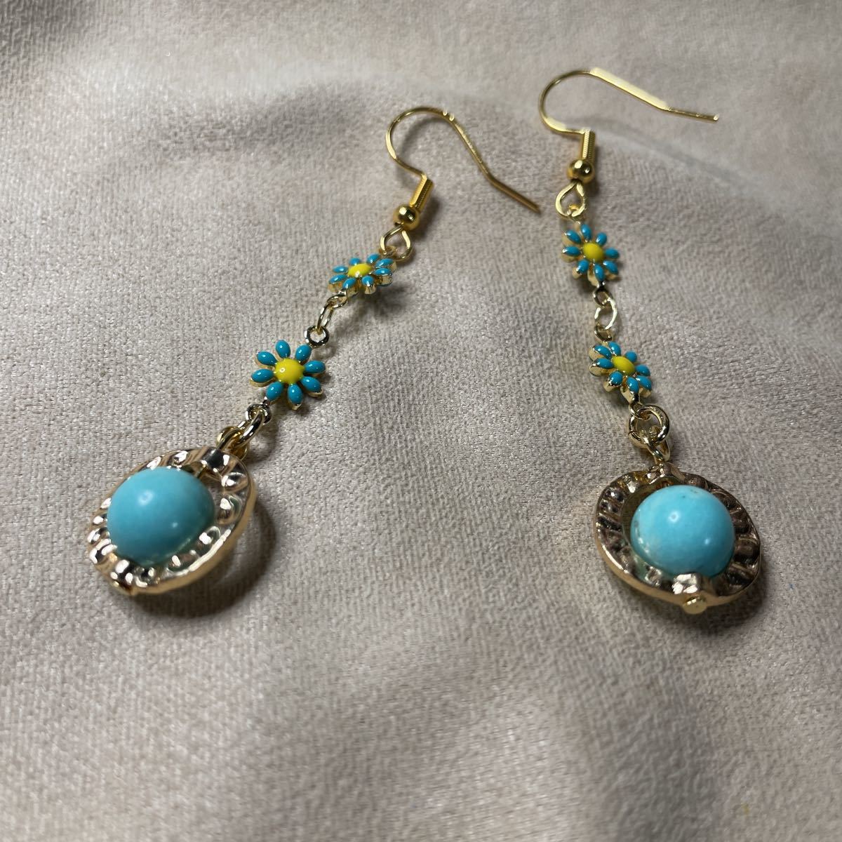 8ミリのターコイズ使用しております。リングパーツに納め可愛い小花繋げました。お花は両面プリントなので裏表気にせず使用していただけます。フックはステンレスに18金メッキしたものを使用しております。