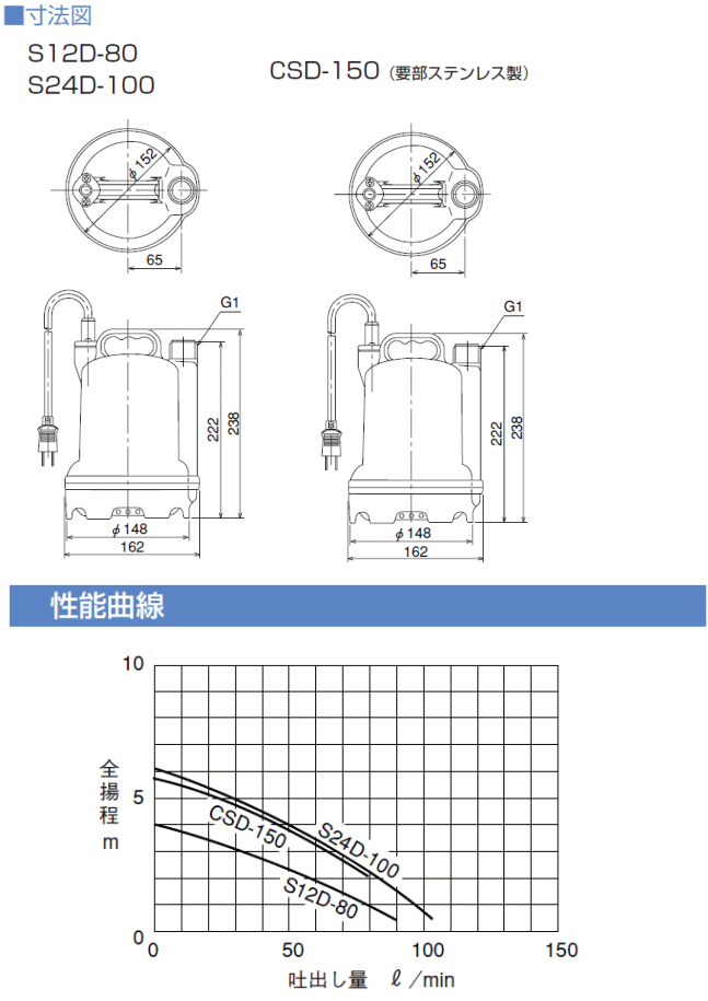 | 型式 | 口径 (mm) | 吐出し量 (L/min) | 全揚程 (m) | 出力 (W) | 定格電圧 (V) | キャブタイヤ ケーブル種類 | 質量 (Kg) |