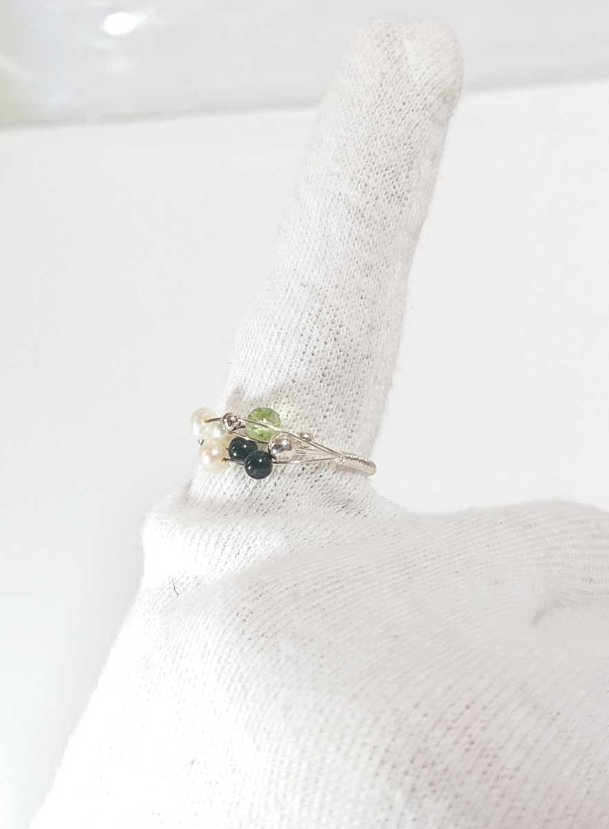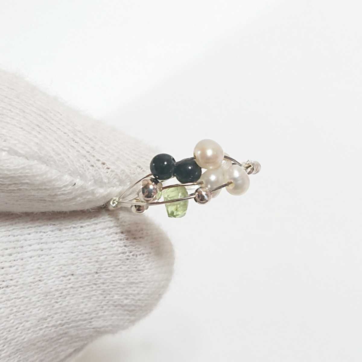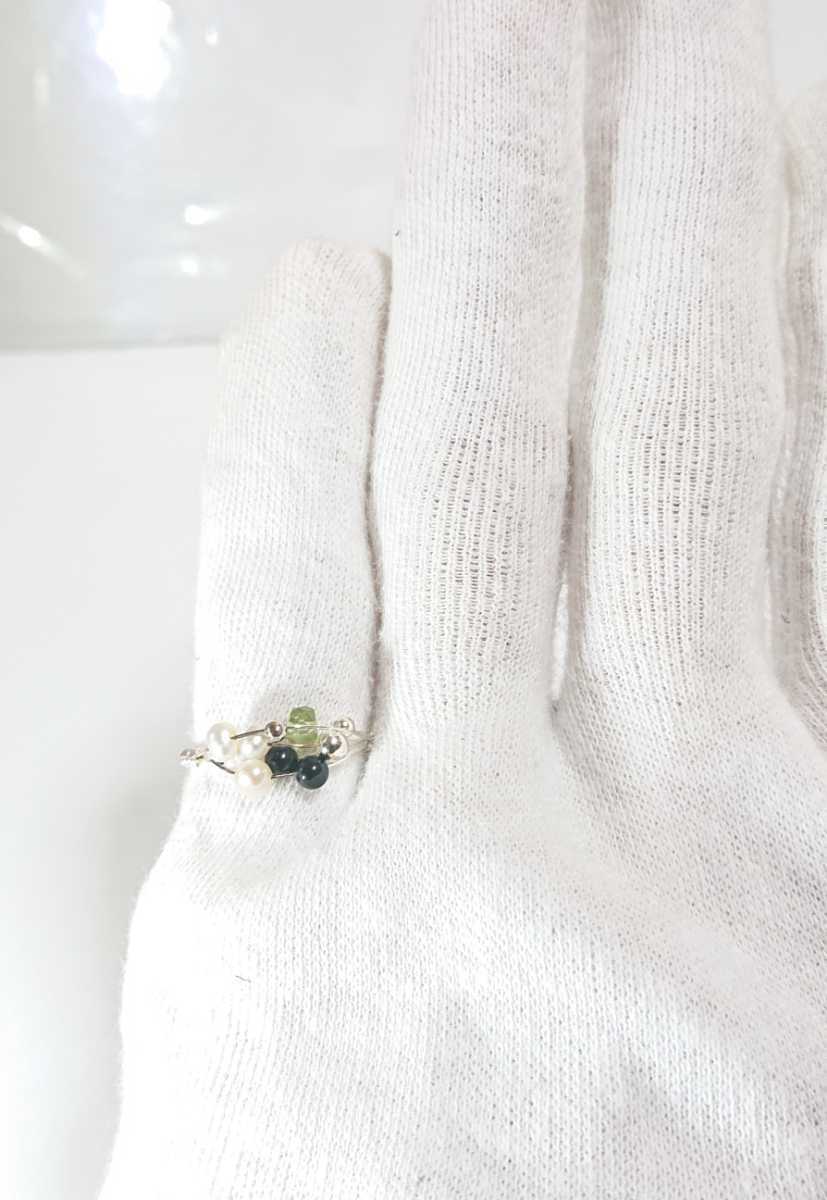 パールをメインにオニキスやペリドットの天然石ビーズを飾り作品のテーマであるアンティークな雰囲気そしてレトロ感やチープさをお楽しみ頂けるリングです♪