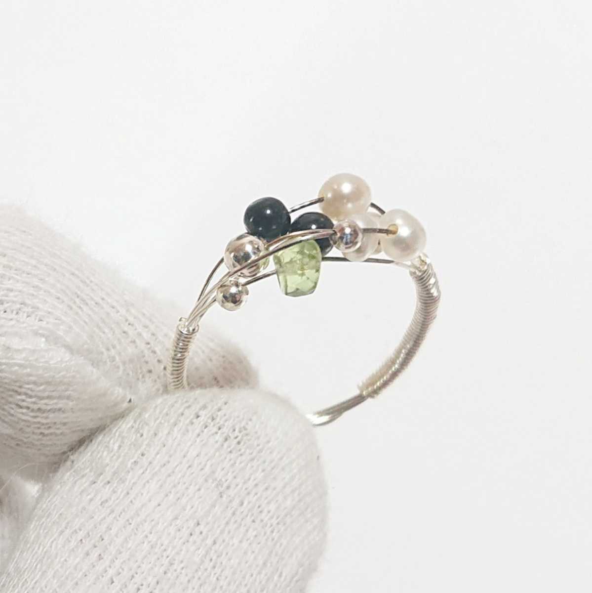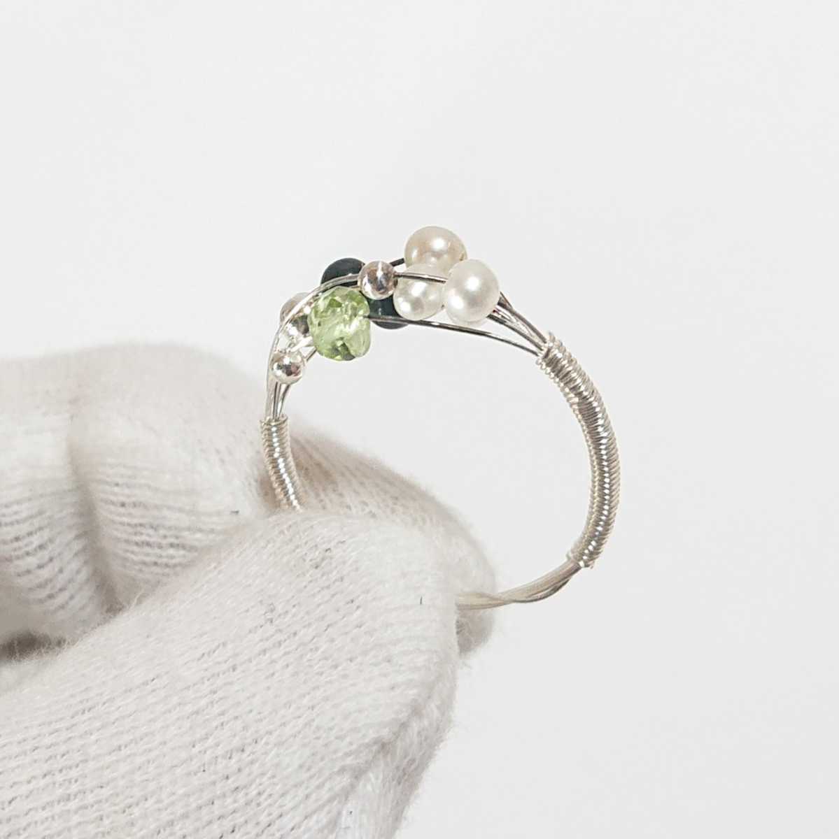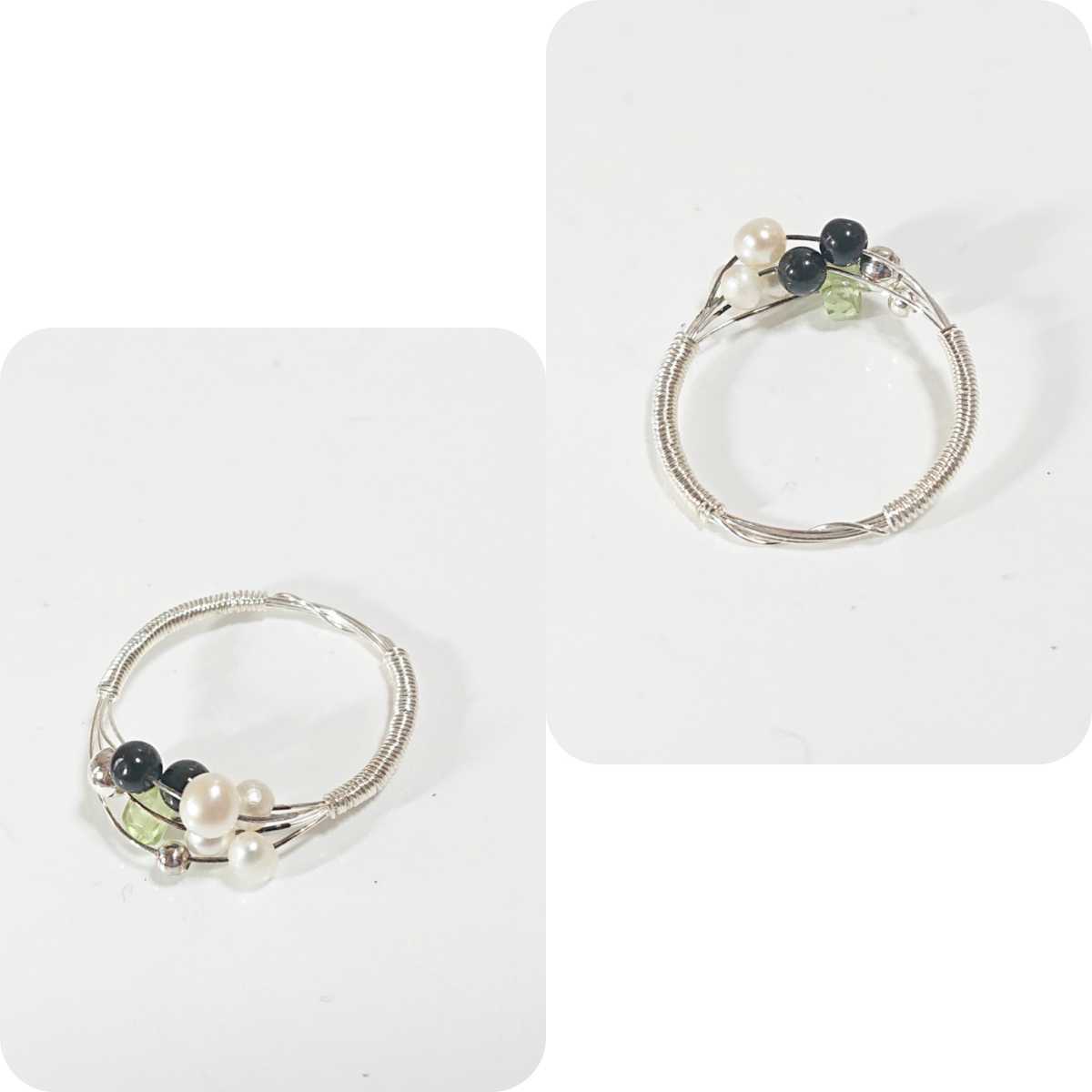 パールをメインにオニキスやペリドットの天然石ビーズを飾り作品のテーマであるアンティークな雰囲気そしてレトロ感やチープさをお楽しみ頂けるリングです♪