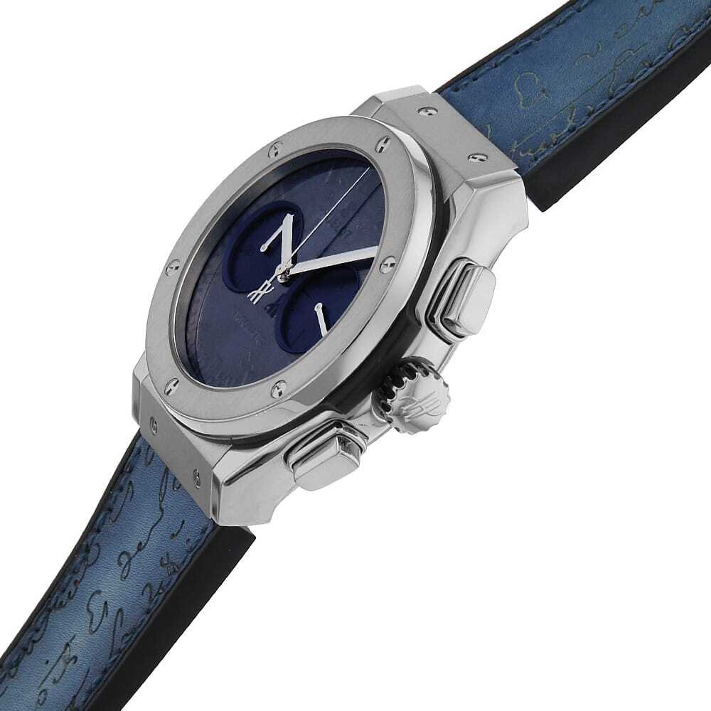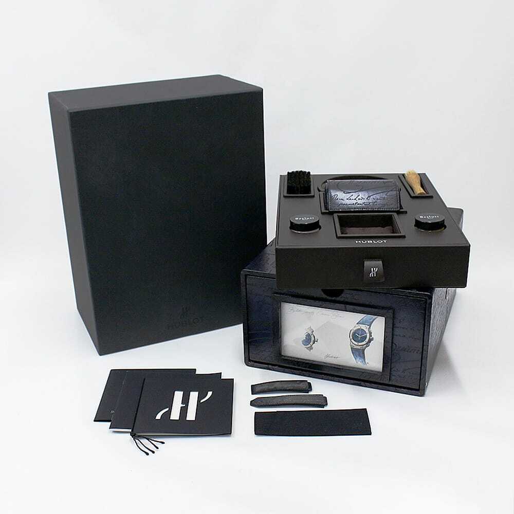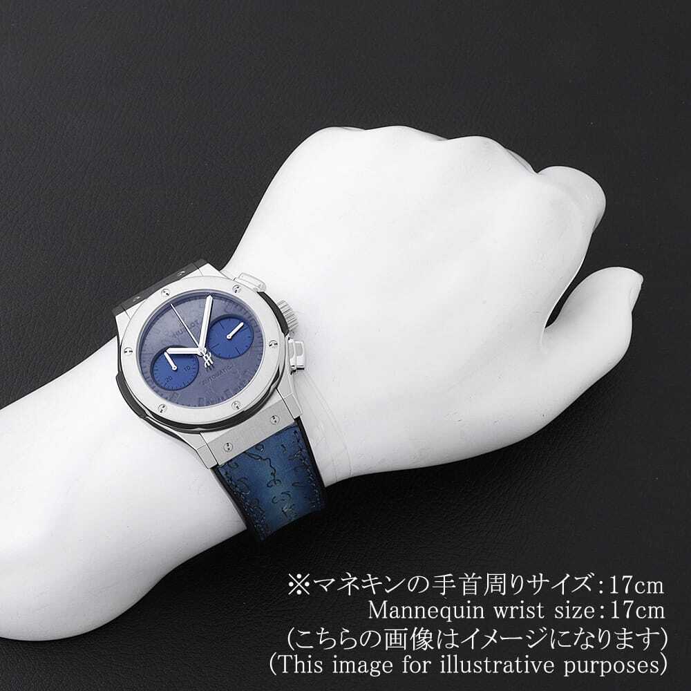 | モデル情報 | 至高のレザーブランド「ベルルッティ」とのコラボレーションシリーズ、第三弾が入荷しました。こちらは、日本100本限定モデルです。ストラップどダイアルには深みをたたえるブルーのヴェネチアレザーを採用、クラシカルとウブロの斬新なデザイン、そしてレザー製造と時計製造の技術が見事フュージョンした一本となります。付属品も特別仕様で、ベルルッティのレザー製品の手入れに欠かせないワックスとブラシが付属します。ムーブメントには自動巻きHUB1143搭載、パワーリザーブ約42時間。50m防水。 |