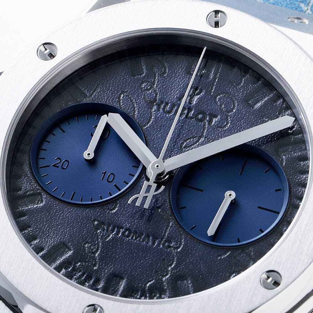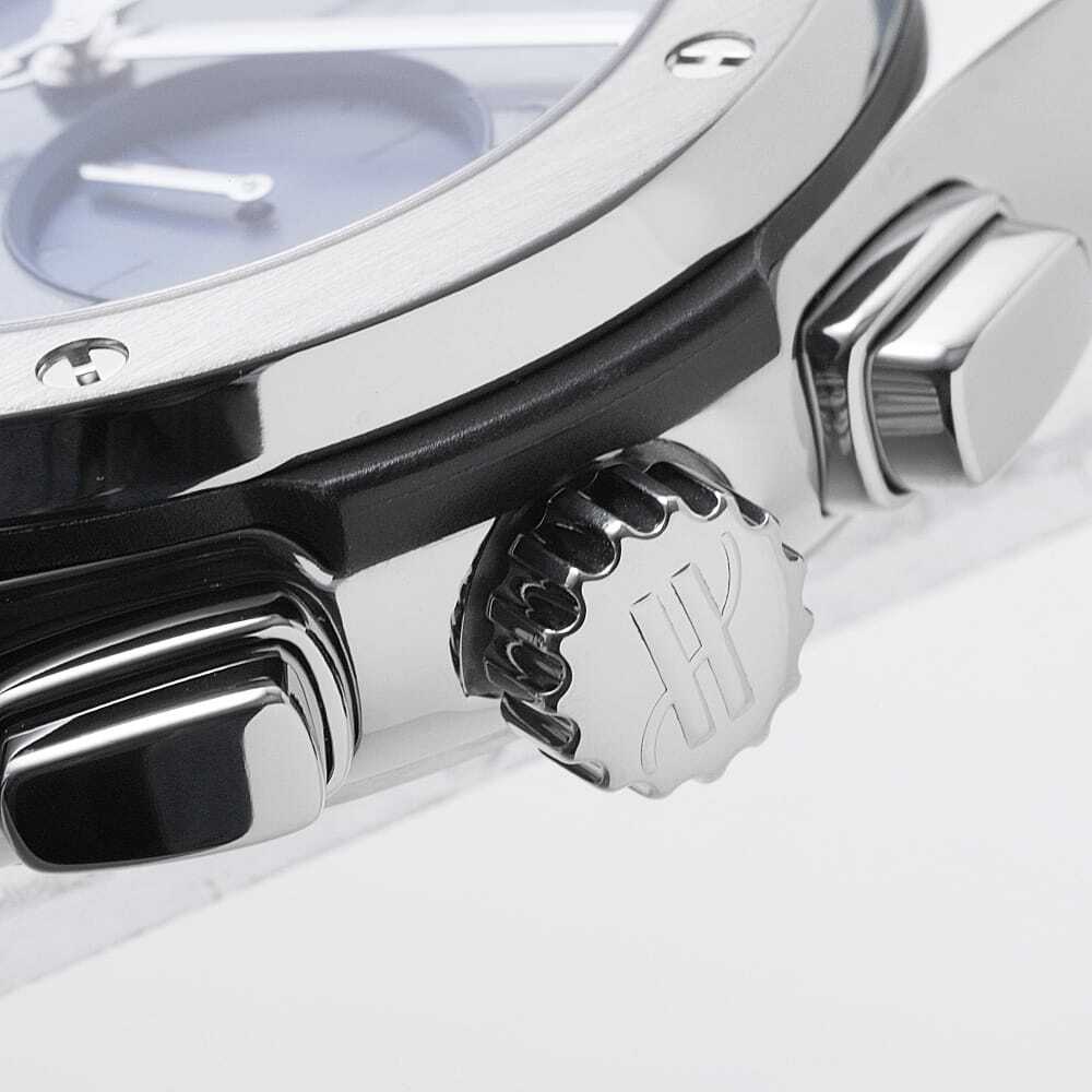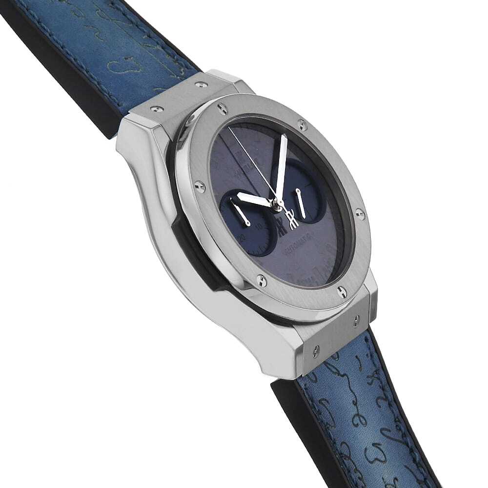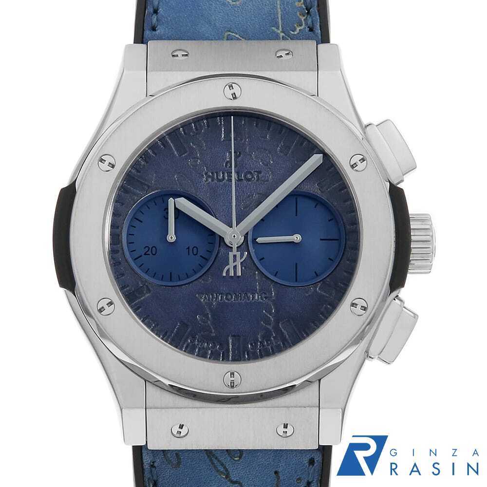 | モデル情報 | 至高のレザーブランド「ベルルッティ」とのコラボレーションシリーズ、第三弾が入荷しました。こちらは、日本100本限定モデルです。ストラップどダイアルには深みをたたえるブルーのヴェネチアレザーを採用、クラシカルとウブロの斬新なデザイン、そしてレザー製造と時計製造の技術が見事フュージョンした一本となります。付属品も特別仕様で、ベルルッティのレザー製品の手入れに欠かせないワックスとブラシが付属します。ムーブメントには自動巻きHUB1143搭載、パワーリザーブ約42時間。50m防水。 |