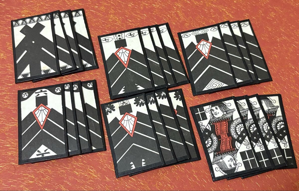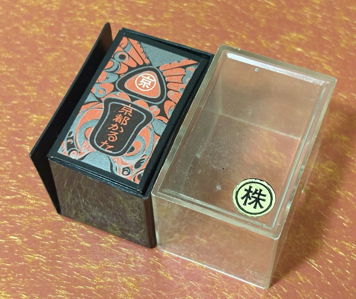 京都市山科区大塚元屋敷町にあった京都かるた株式会社の株札です。ピン(1)の札が1枚欠けており白札と合わせて40枚となっております。赤ピンが他の株札と比べても特徴的ですので、資料として是非ご入札お待ちしております。