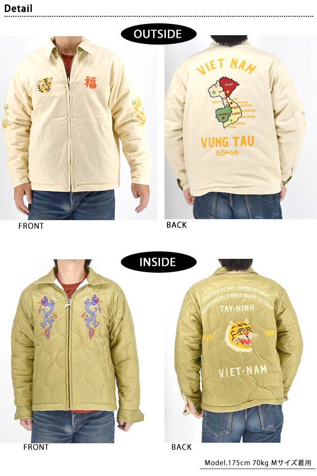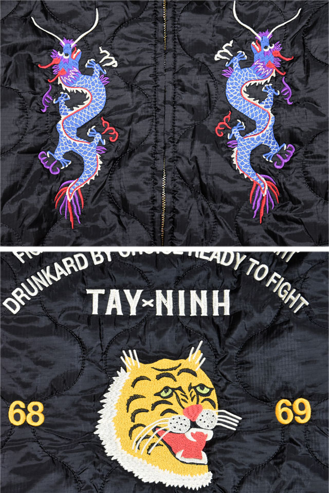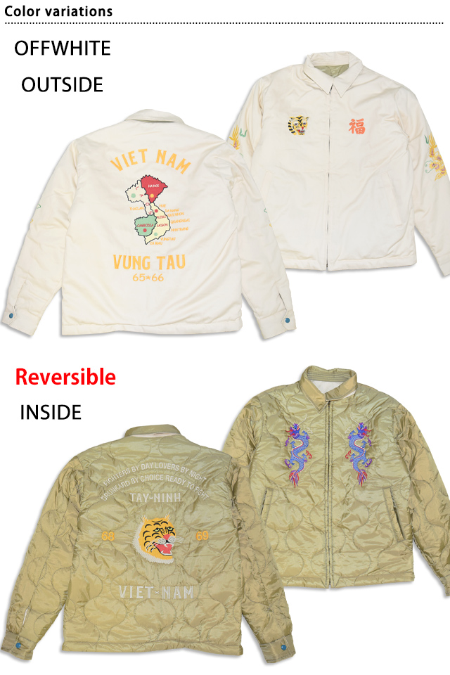日本で初めてオリジナルのフライトジャケットを生み出し、その後も数々の国内製ミリタリー商品を製造する「ヒューストン」から「コットンツイル×ナイロン リバーシブルベトジャン/REVERSIBLE VIETNAM JACKET(51514)」のご紹介です。 肉厚で丈夫なコットンツイル生地と、高い耐久性を持つナイロンリップ生地を使用したリバーシブルベトジャンが登場しました。 ヴィンテージをイメージした手振り風刺繍を採用し、後身頃にはインパクトのある虎柄を配置。 表裏で全く違ったアイテムとなっておりますので、一着で二度おいしいジャケットです。 | |||||||||||||||||||||||||