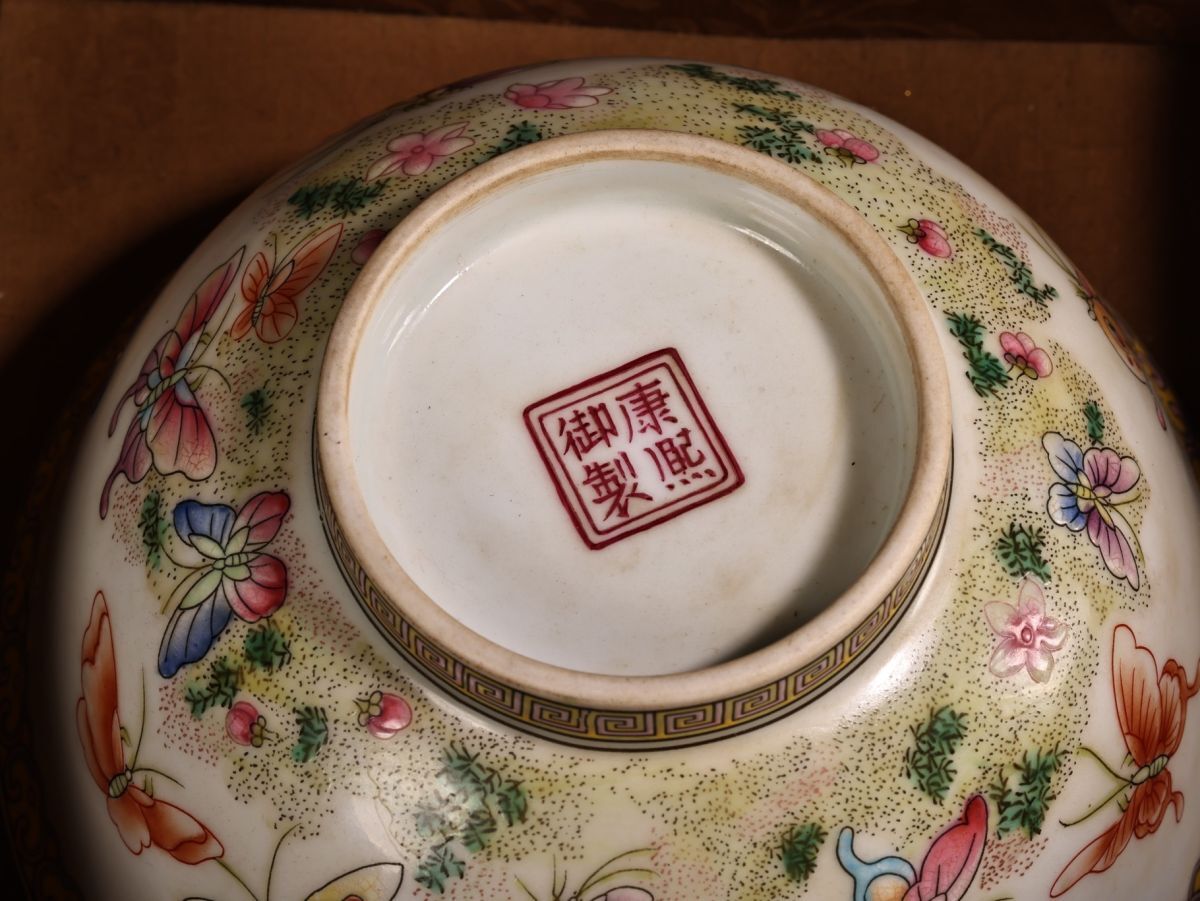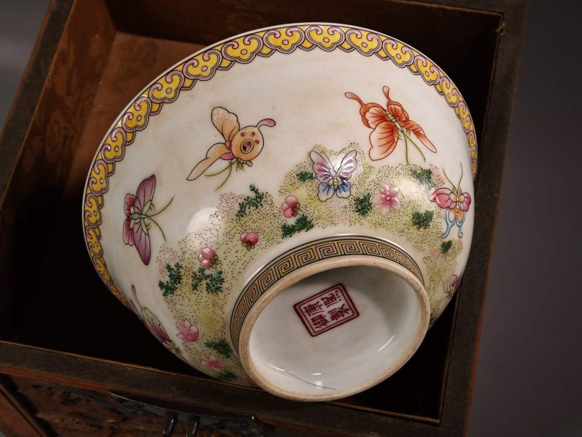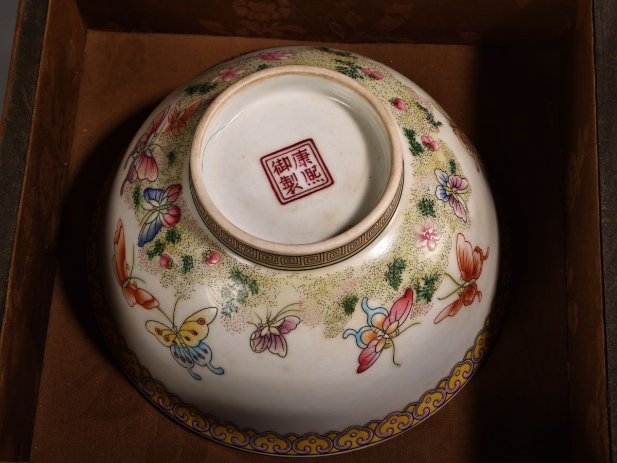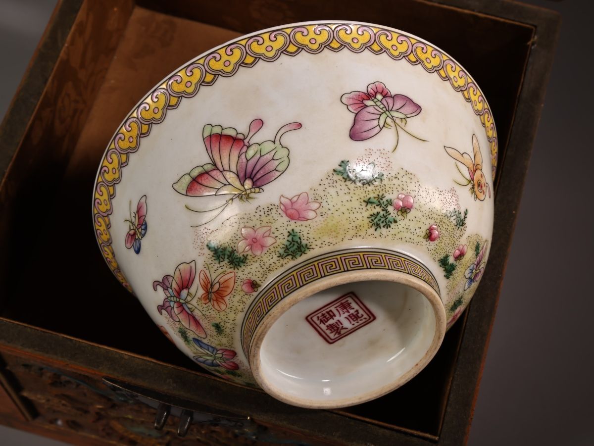 【永】清時代 康熙御製 粉彩花蝶紋碗 漆盒 古陶磁器 陶芸 皿 中国陶瓷器 唐瓷 置物擺件 古美術品 古賞物 収集 旧家蔵出 中国唐物 A124