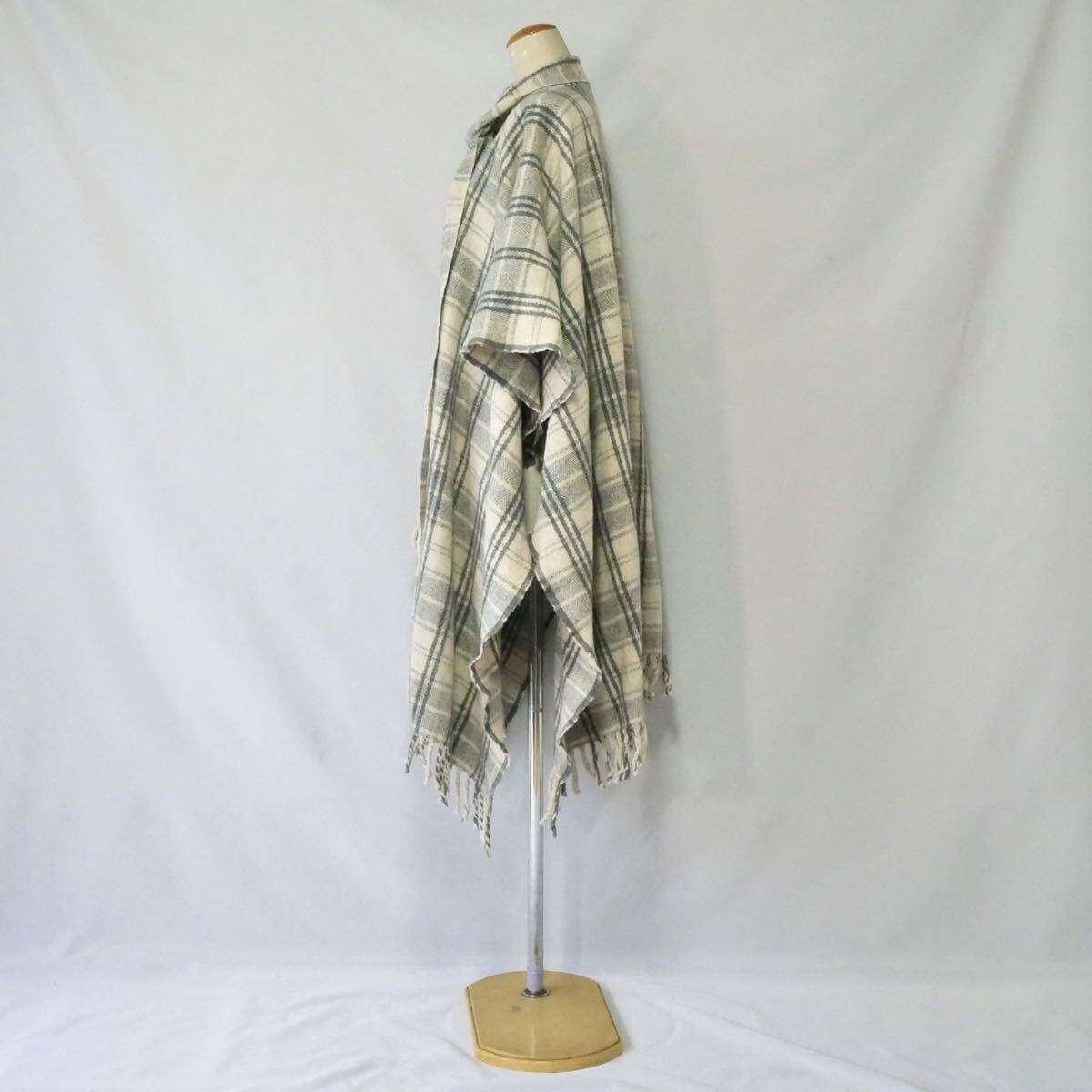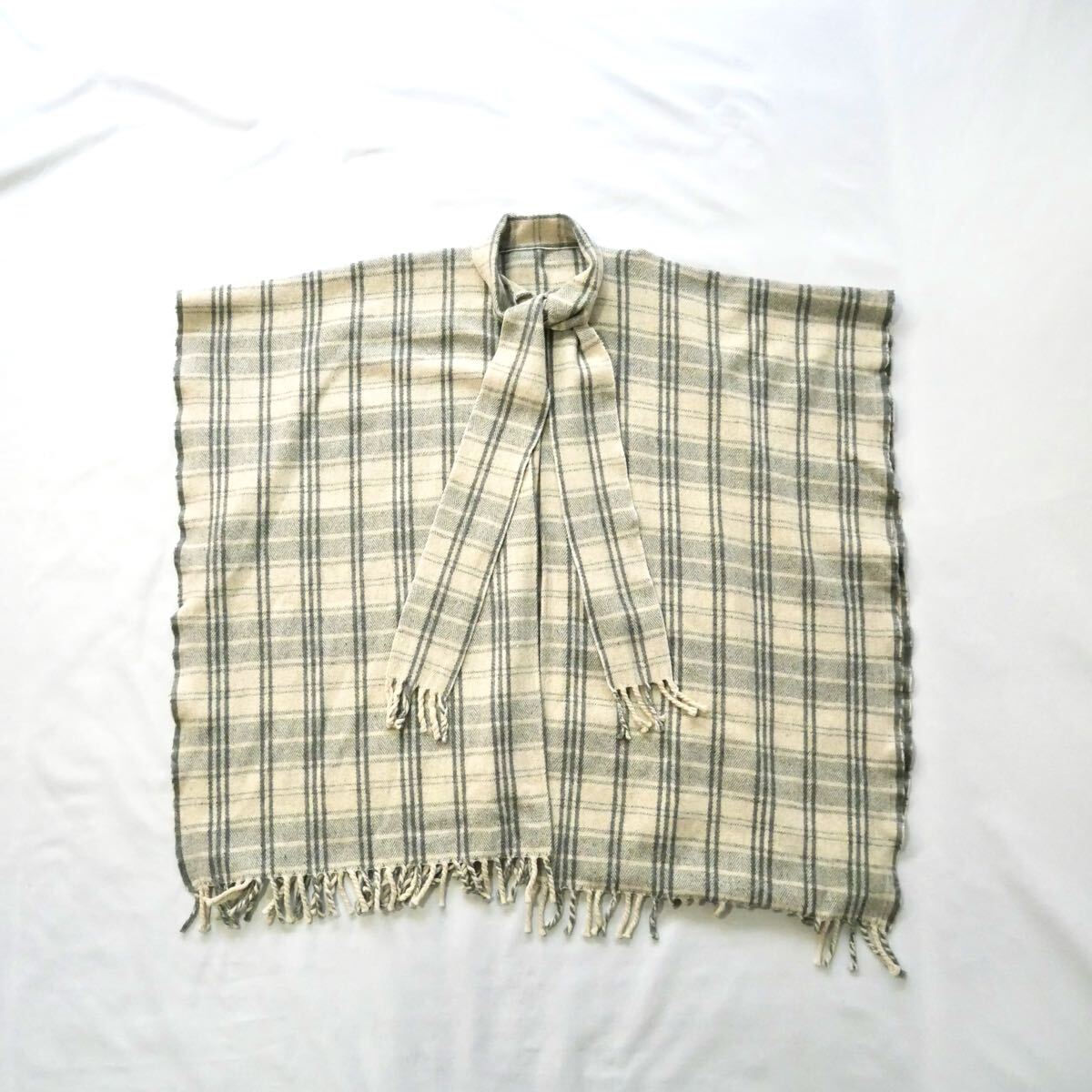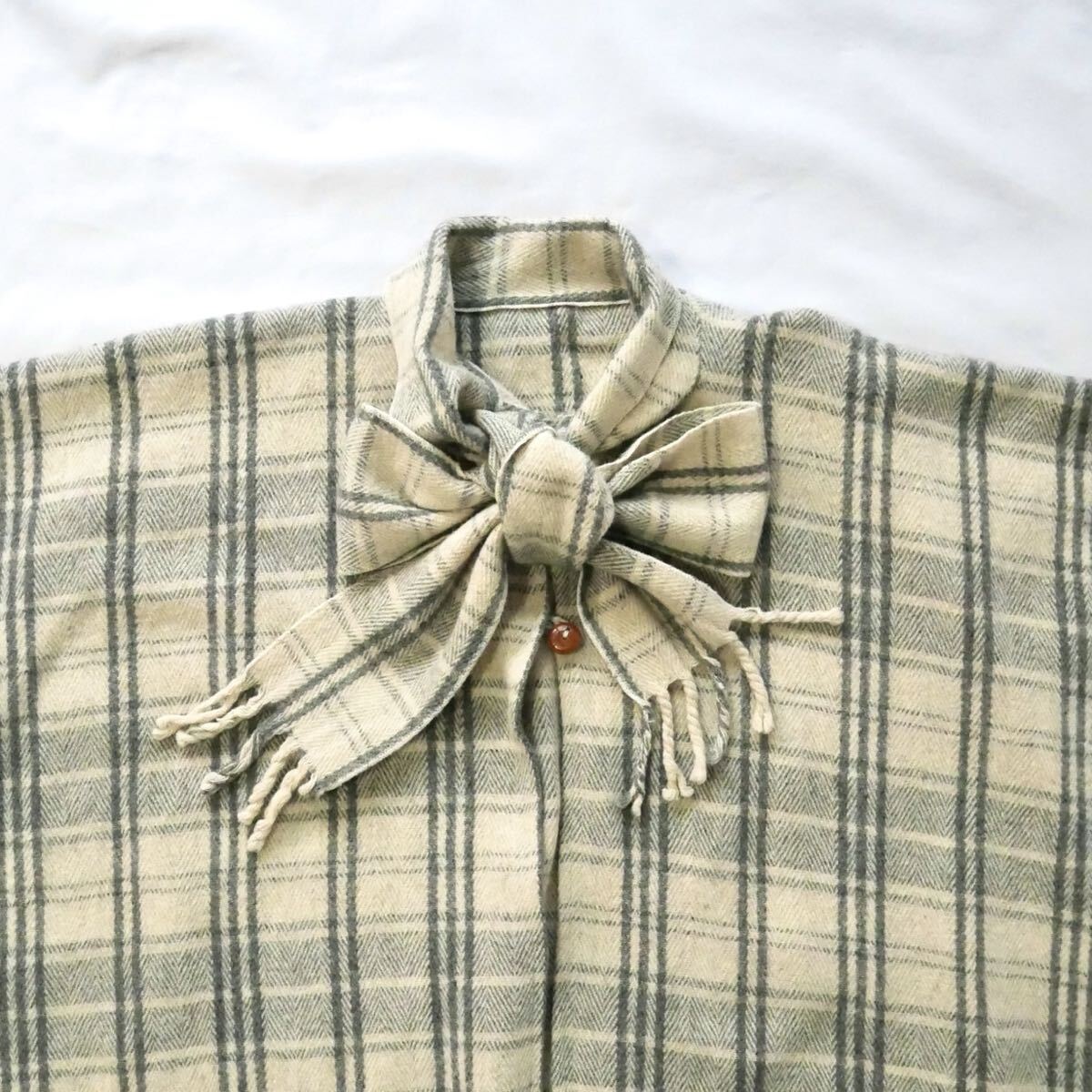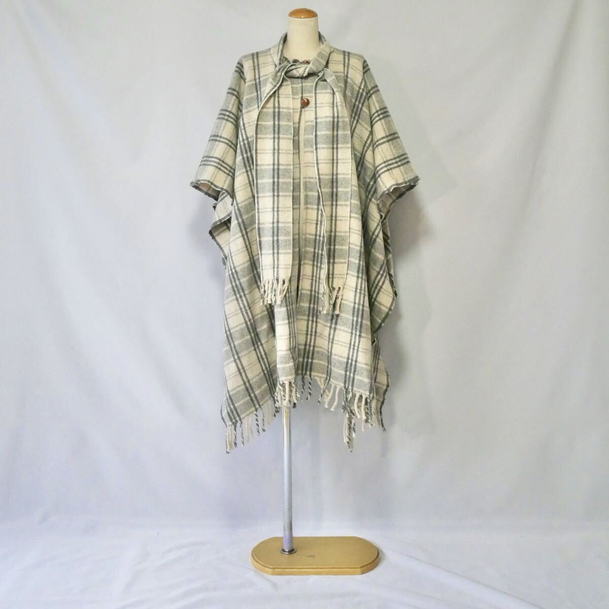 ストールマフラー付きのグレージュチェックウールケープポンチョコートです。