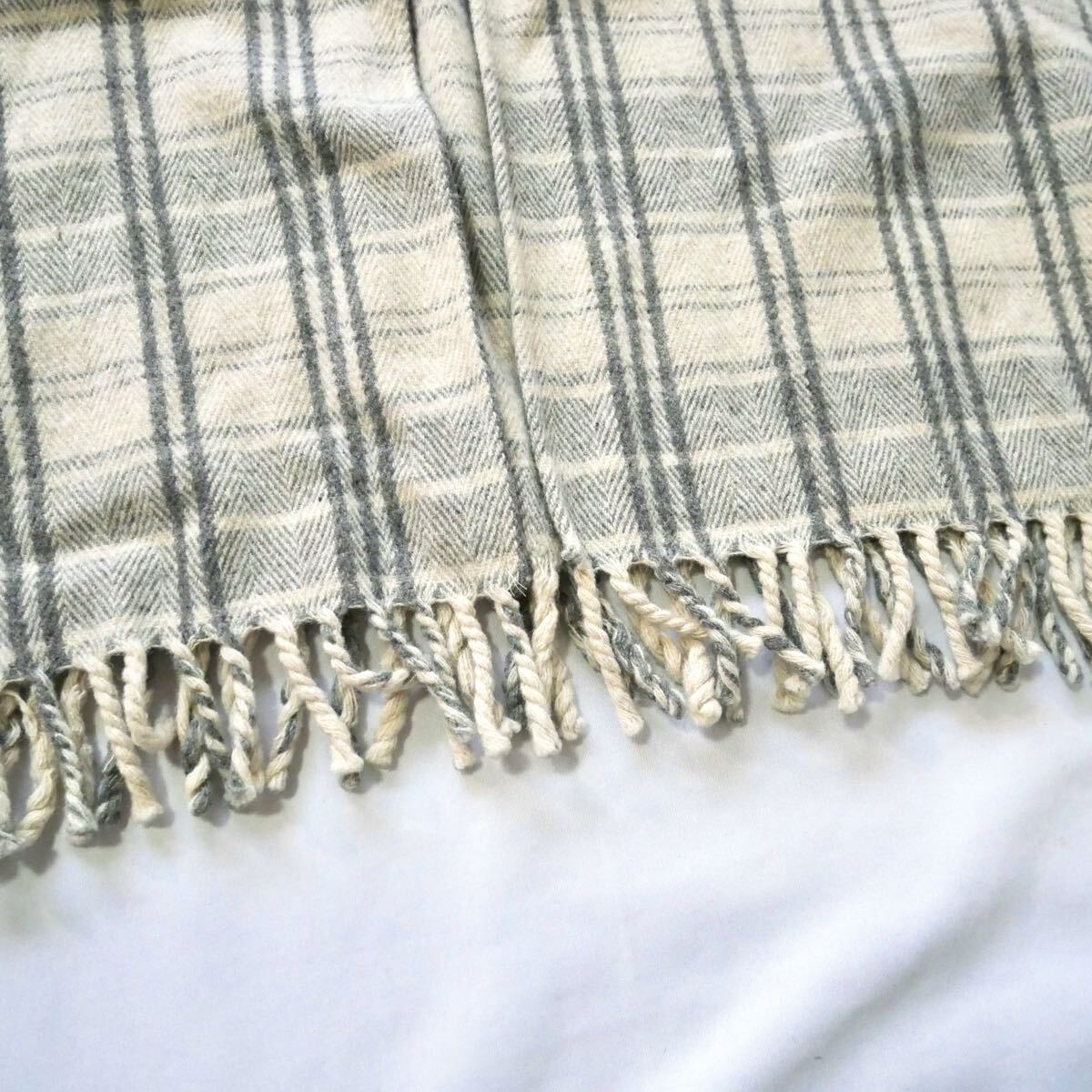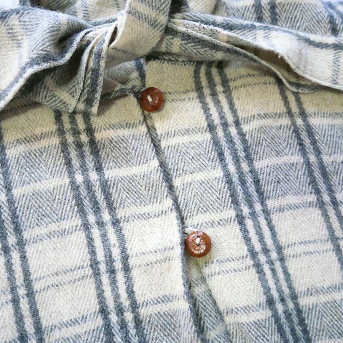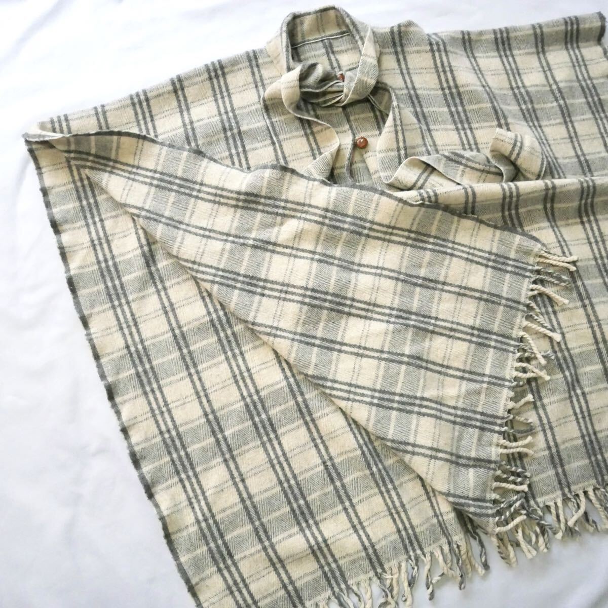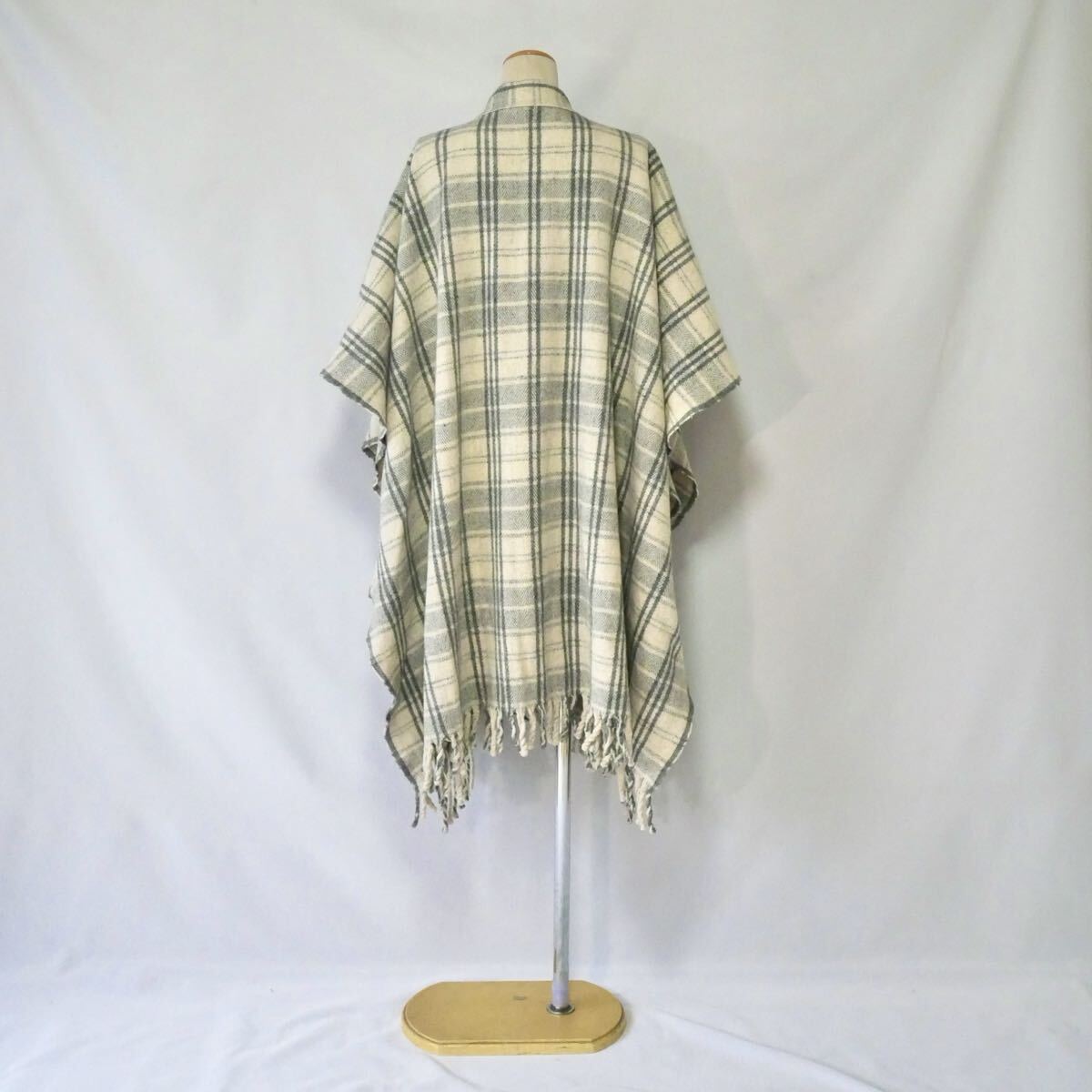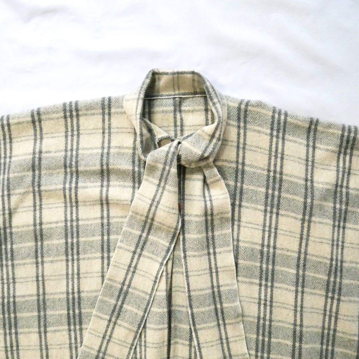 ストールマフラー付きのグレージュチェックウールケープポンチョコートです。