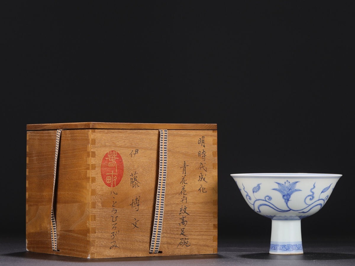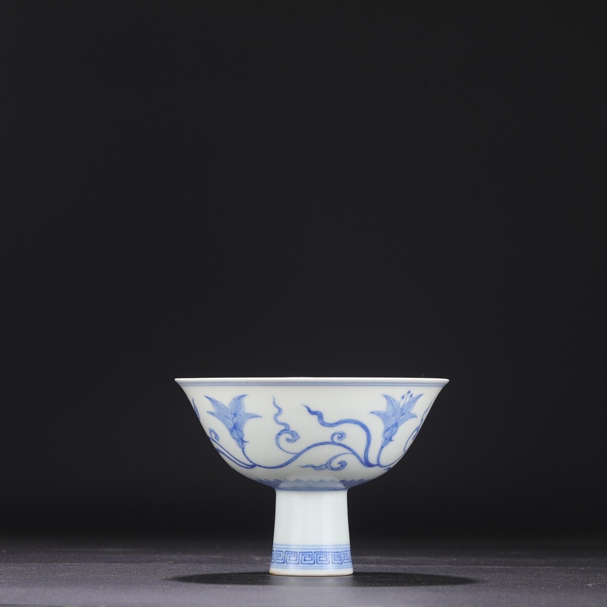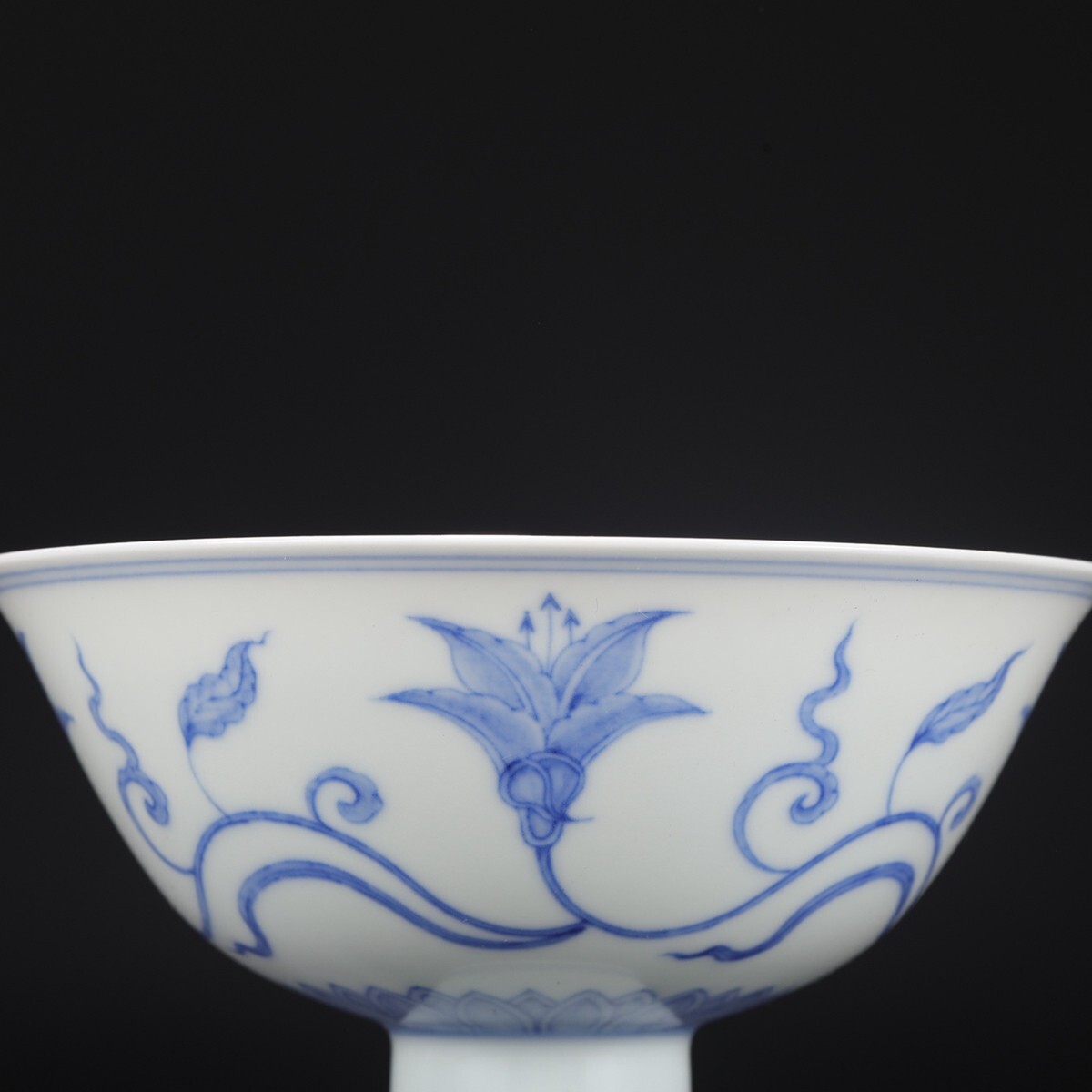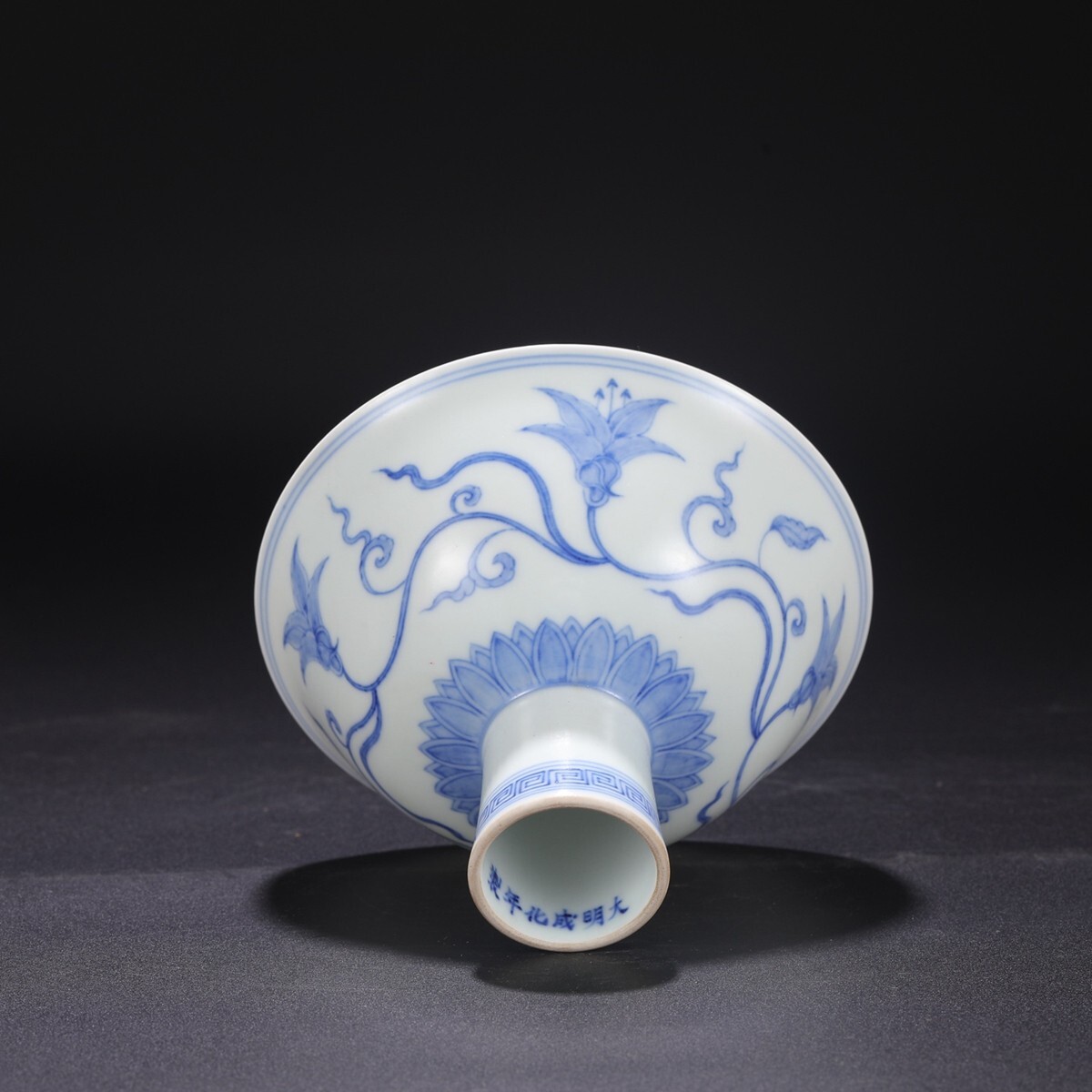 【瓏】陶磁器 青花花卉紋 高足碗 大明成化年製 染付 置物擺件 古賞物 古美術 陶芸 蔵出