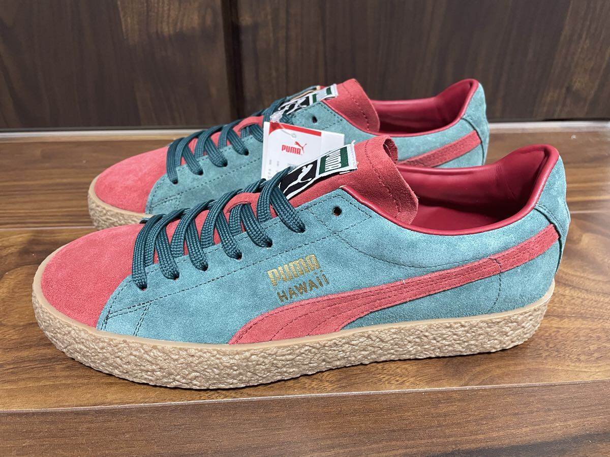 スエード素材の青と赤のPUMA Hawaiiスニーカー、ラバーソールで快適な履き心地。