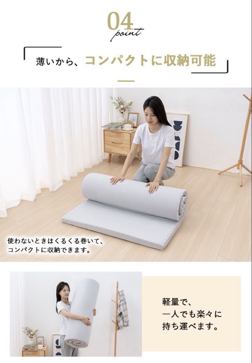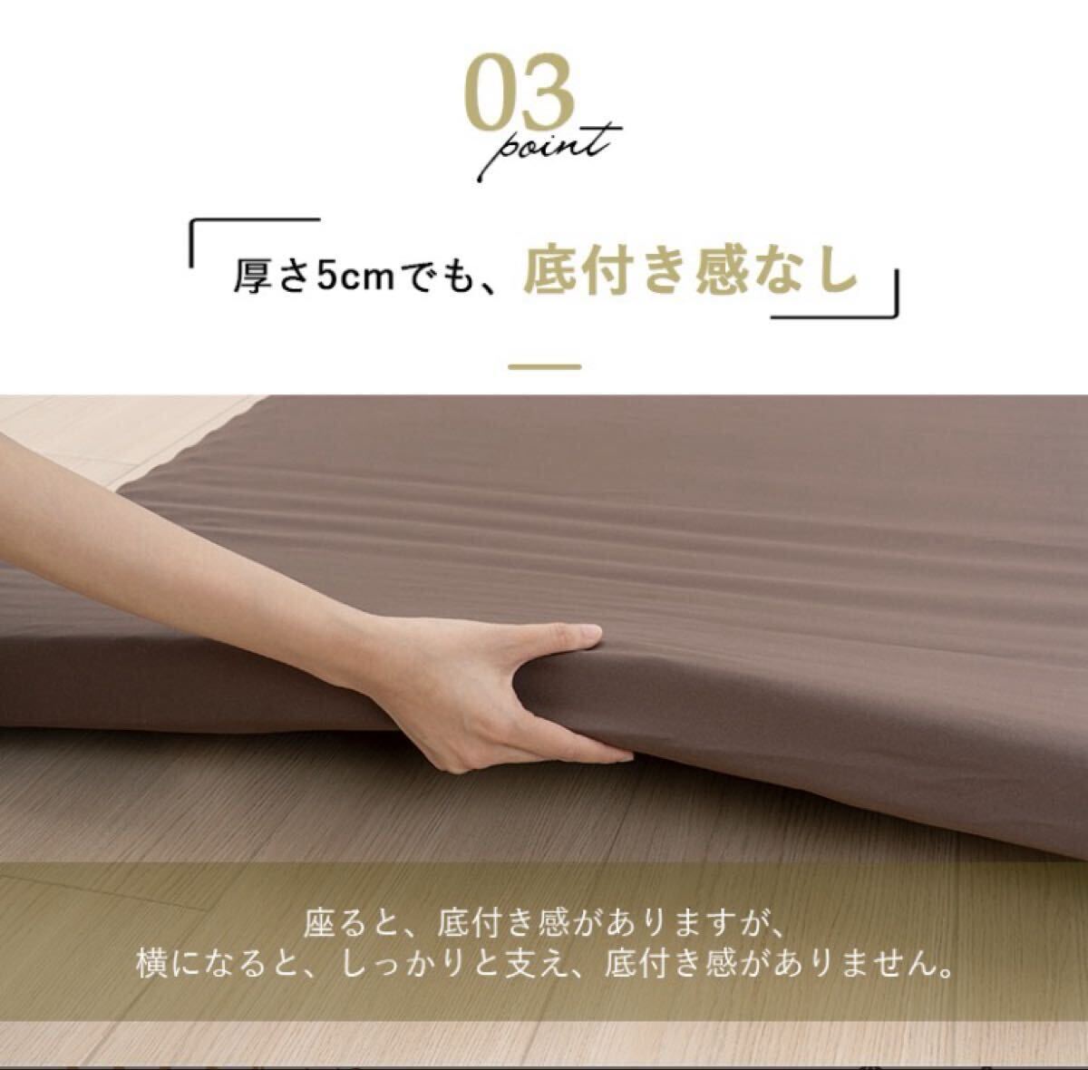 手で押すと、弾力性があります。座ると、底付き感がありますが、横になると、しっかりと支え、底付き感がありません。フローリングでもベッドでもそのまま敷けます。